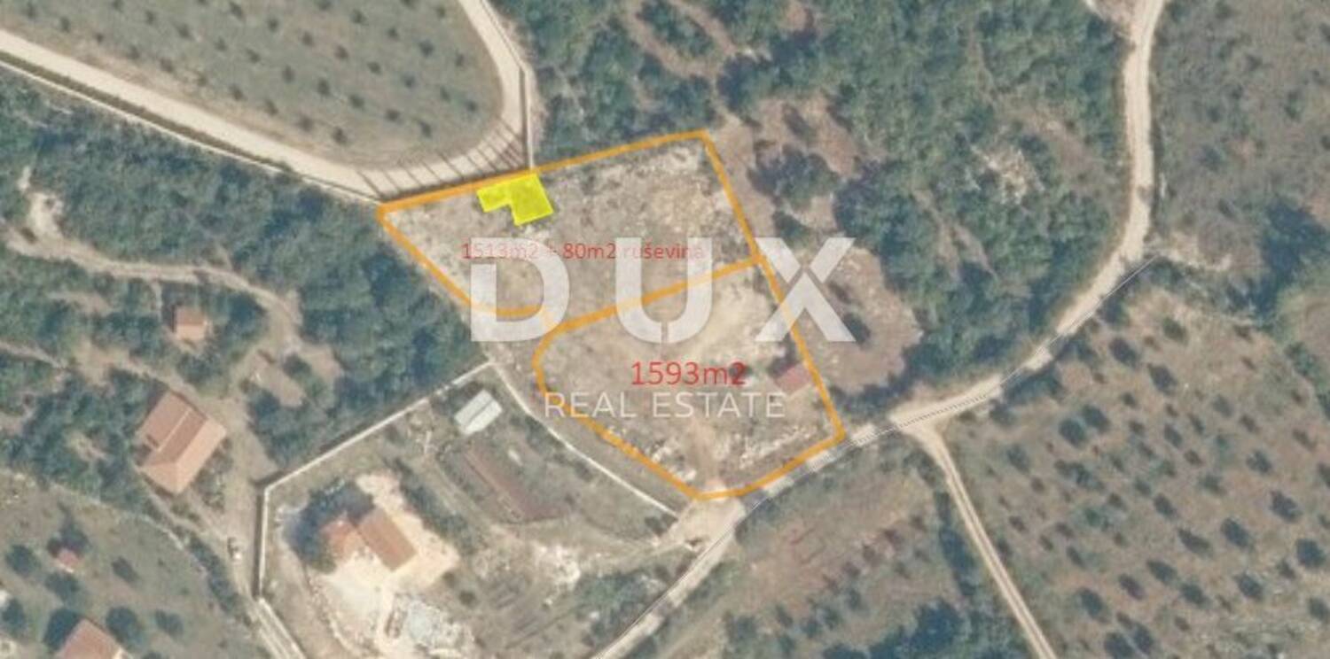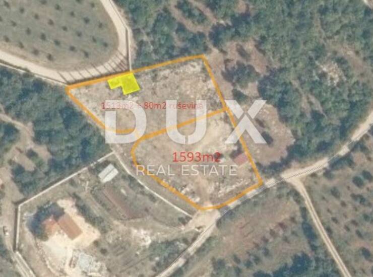 Prodaje se zemljište površine 3186 m2 sa ucrtanom ruševinom od 80m2. Parcela se sastoji od 2 međusobno povezane čestice, koja čini pravokutni oblik, dimenzije cca 65x49m. Struja i voda uz teren sa kojega se pruža pogled na more i otoke.