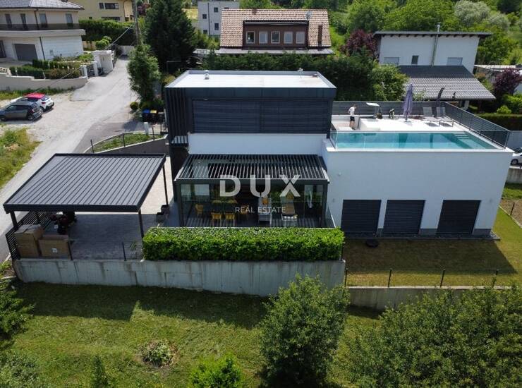 Prodaje se moderna kuća s bazenom na krovu u mirnom i atraktivnom dijelu Samobora – Donji Giznik. Riječ je o novogradnji koja spaja udobnost, luksuz i vrhunsku funkcionalnost, smještenoj u lijepom i tihom okruženju, a opet u neposrednoj blizini svih važnih sadržaja – škola, vrtića i trgovina.