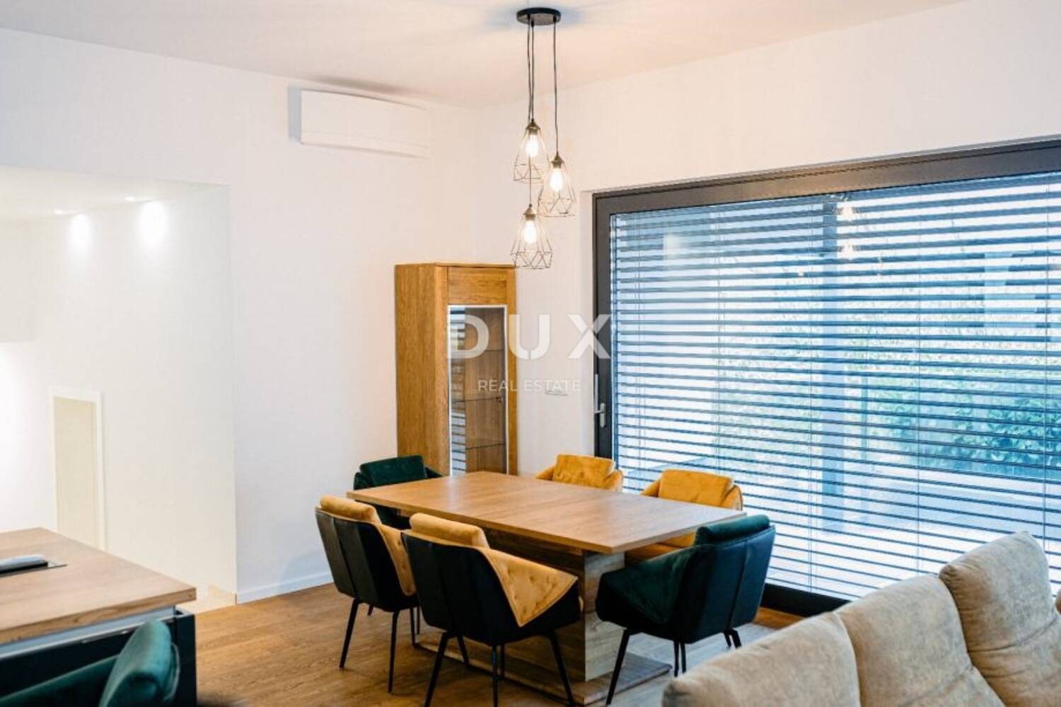Kuća se sastoji od prostranog prizemlja s elegantnim dnevnim boravkom, velikom kuhinjom i blagovaonicom iz koje se stepenicama silazi do spavaćeg dijela. Tamo se nalaze tri spavaće sobe – dvije dječje (od kojih se jedna može koristiti i kao gostinjska) te glavna spavaća soba s vlastitom kupaonicom i walk-in ormarom. U prizemlju se nalazi i manja kotlovnica s vešerajem i pročišćivačem vode. Ulazna vrata su protuprovalna i otvaraju se na otisak prsta.