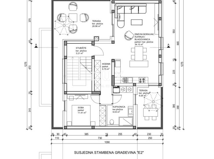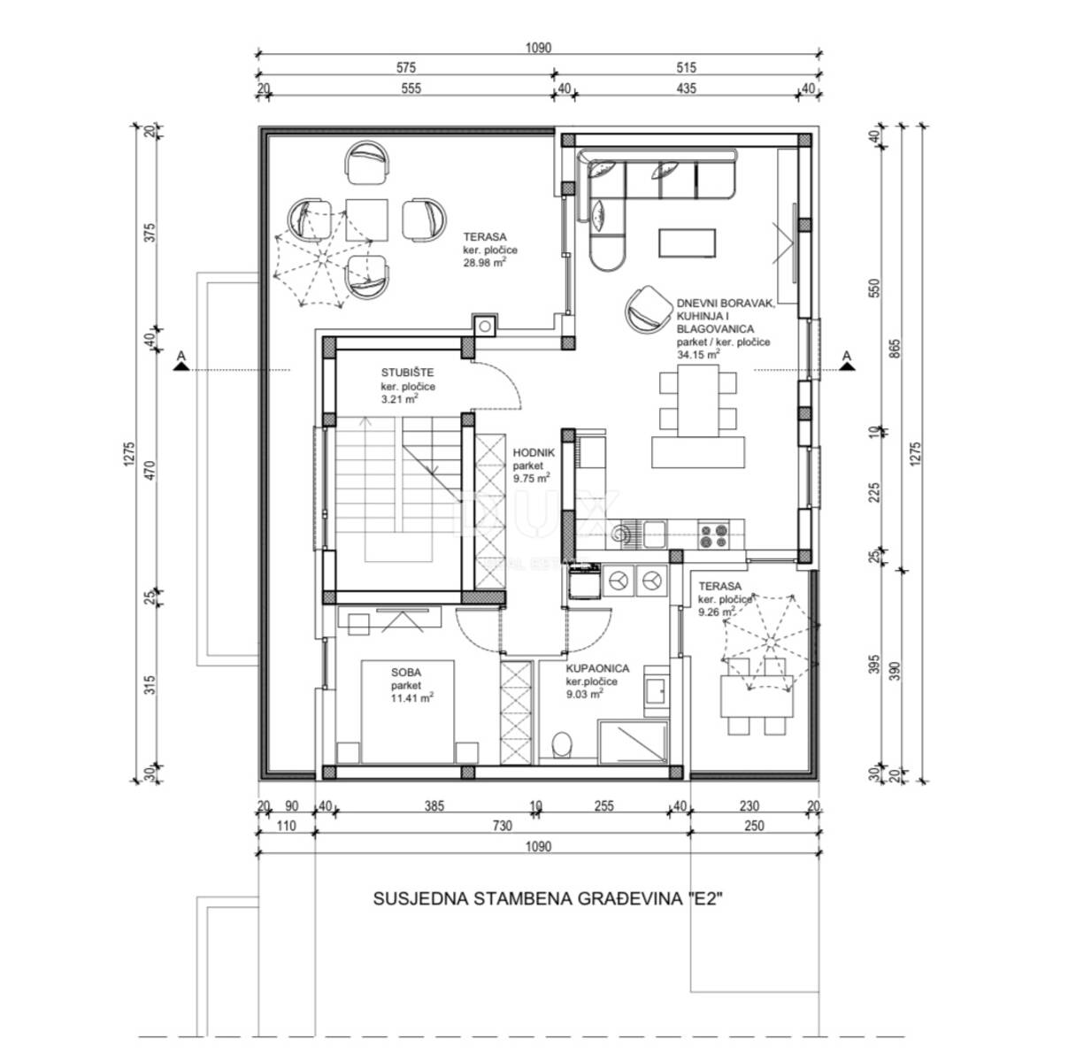 Nudimo vam moderan stan u novogradnji površine 104,81 m² (s koef. = 75,02 m²), od kojih je 28,98 m² (koef 0,25 = 7,25 m²) nenatkrivene terase i 9,26 m² (koef 0,25 = 2,32 m²) druge nenatkrivene terase, koji će započeti s radovima ove jeseni, a planirani završetak gradnje je do kraja sljedeće godine. Stan se sastoji od hodnika, prostranog dnevnog boravka, kuhinje s blagovaonicom, ugodne spavaće sobe, moderne kupaonice i dvije nenatkrivene terase. Stanu pripada i spremište 2,23 m² (koef 0,5 = 1,12 m²).