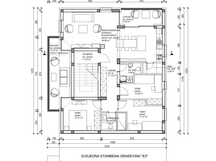 Ukupno: 115,37 m² (s koef. = 105,09 m²)
