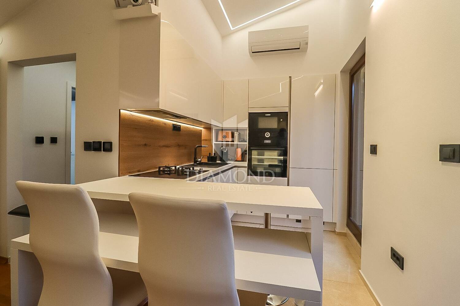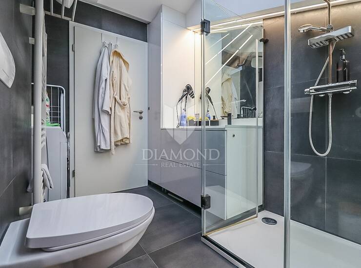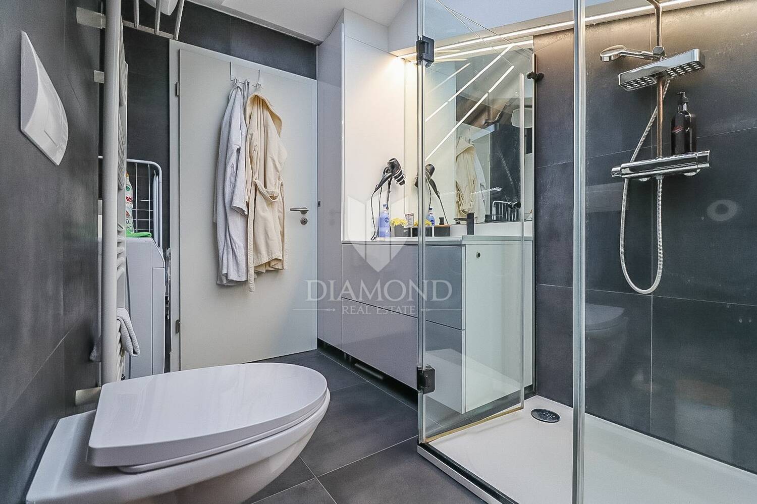 Interijer je dizajniran prema najvišim standardima. Kupaonica je opremljena inteligentnim ogledalom koje ujedno funkcionira kao televizor, jacuzzijem i modernim zvučnim sustavom, stvarajući atmosferu privatnog wellnessa. Potpuno nova kuhinja s visokokvalitetnim uređajima zadovoljit će potrebe svakoga tko želi praktičan, moderan i estetikom usklađen prostor za svakodnevnu upotrebu.
