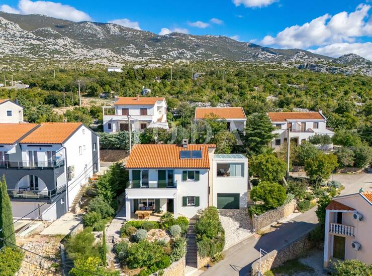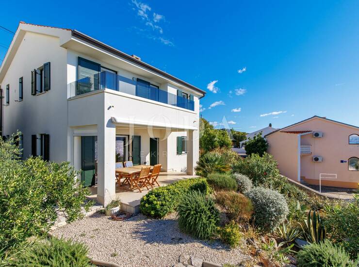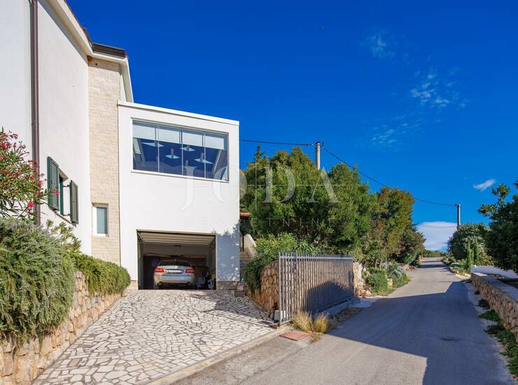Sama kuća je smještena unutar okućnice koja je potpuno ograđena i uređena, sa puno mediteranskog bilja. Odličan prilaz koji vodi direktno u garažu, iz koje se direktno dolazi u kuću.