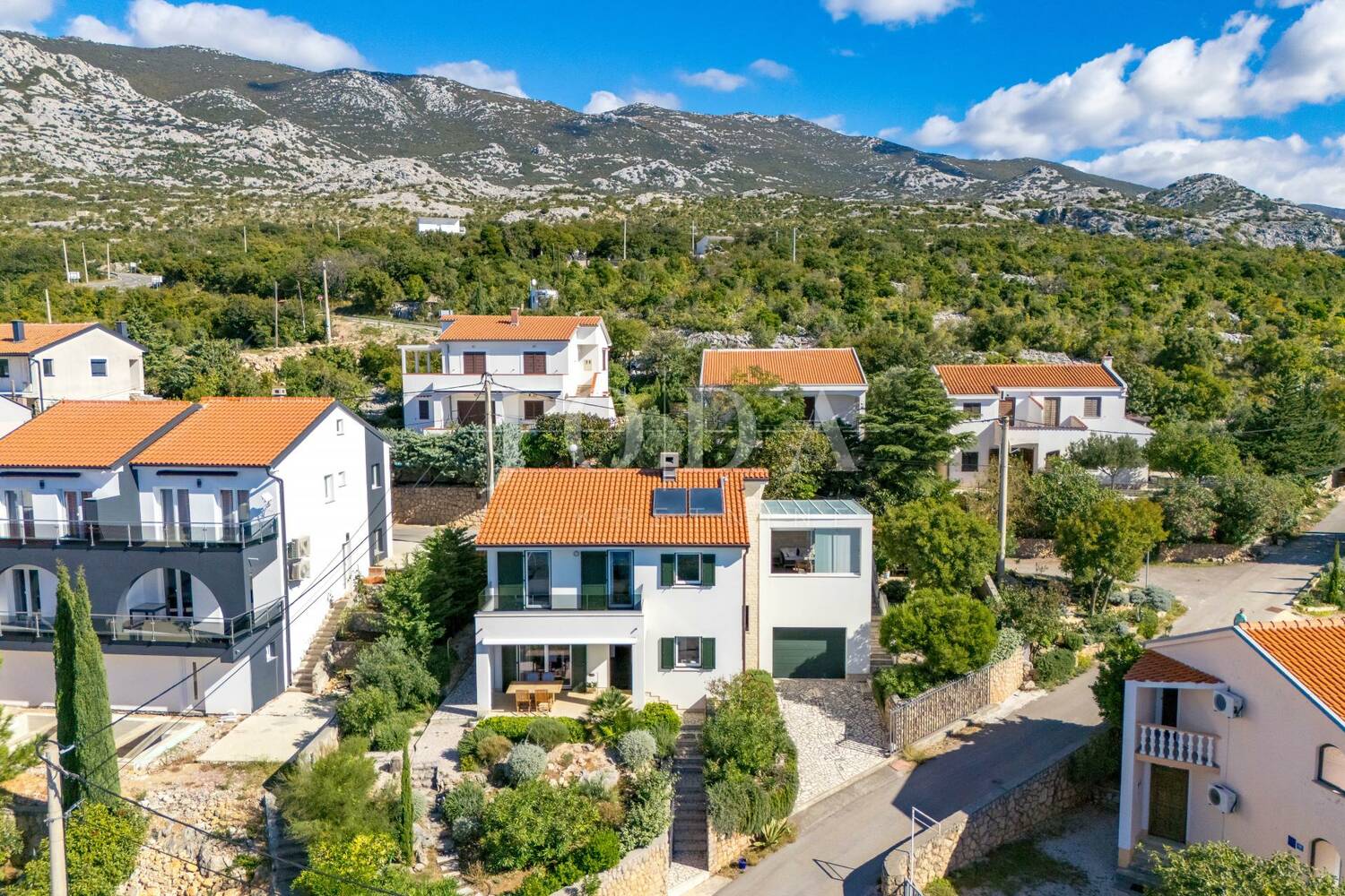 Sam stambeni prostor je podijeljen na način da je u prizemlju veliki otvoreni koncept dnevnog boravka, kuhinje i balagavonice sa izlazima na terasu i kupaonica a unutarnje stubište vodi na kat gdje se nalaze tri spavaće sobe i kupaonica, te zimski vrt sa spektakularnim pogledom na more i otok Pag.