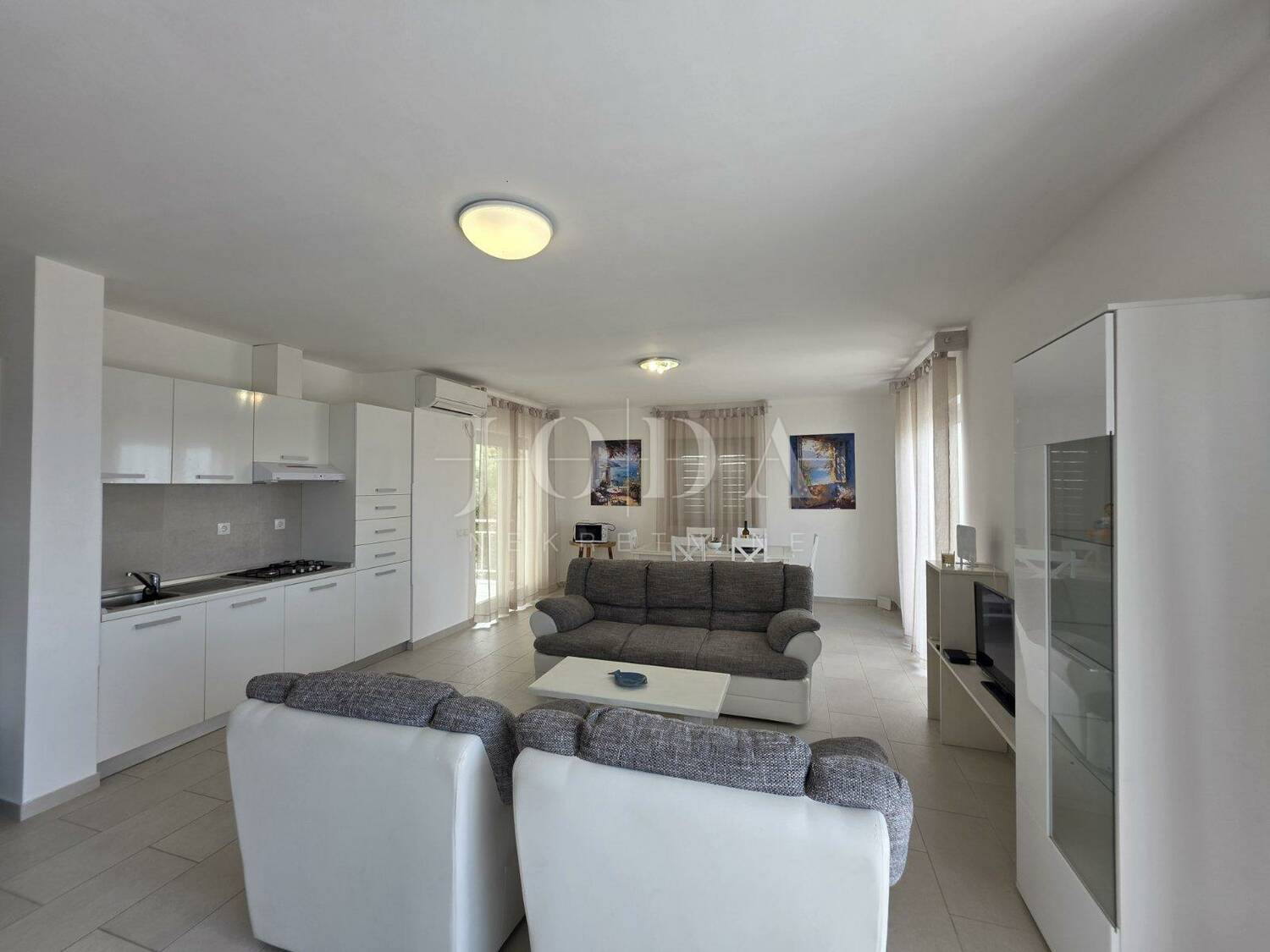 U zelenoj oazi mira, s prekrasnim pogledom na beskrajno morsko plavetnilo, smještena je ova u potpunosti namještena i klimatizirana kuća, spremna za useljenje ili uživanje u odmoru. U suterenu se nalazi udobna garsonijera, dok prizemlje nudi dvije spavaće sobe, ulazni hodnik, kupaonicu te prostrani dnevni boravak s blagovaonicom i kuhinjom u open space konceptu, iz kojeg se izlazi na terasu s lijepim pogledom na more. Na katu je raspored identičan, a stan ima izlaz na balkon i natkrivenu terasu istočne orijentacije, idealnu za opuštanje u svako doba dana. Unutar prostrane okućnice osiguran je parking za više vozila, što ovu nekretninu čini dobitnom kombinacijom za savršen odmor ili miran obiteljski život.