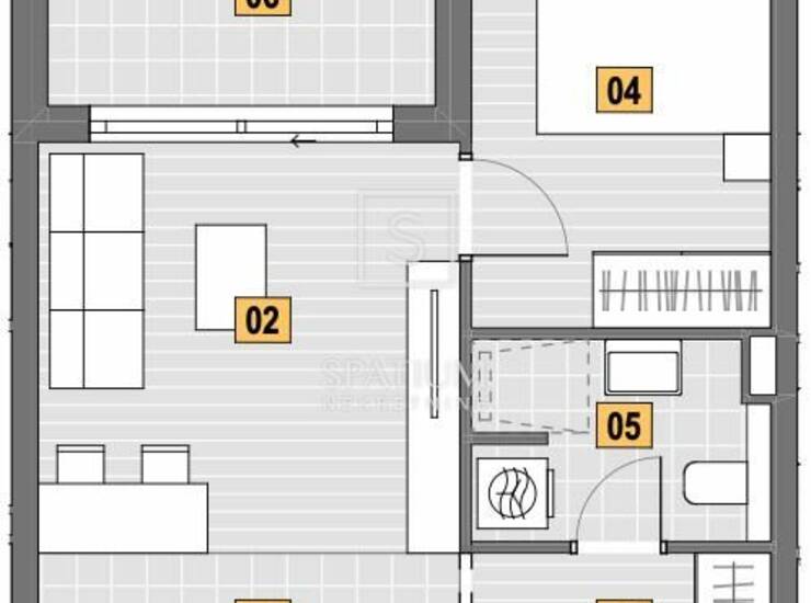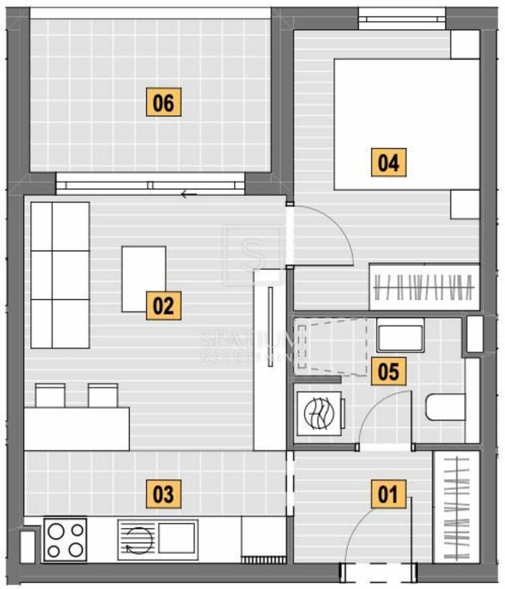 Stan površine 41,52m2, nalazi se na prvom katu, sastoji se od degažmana, kuhinje, dnevnog boravka s blagovaonicom, spavaće sobe, kupaone i balkona.