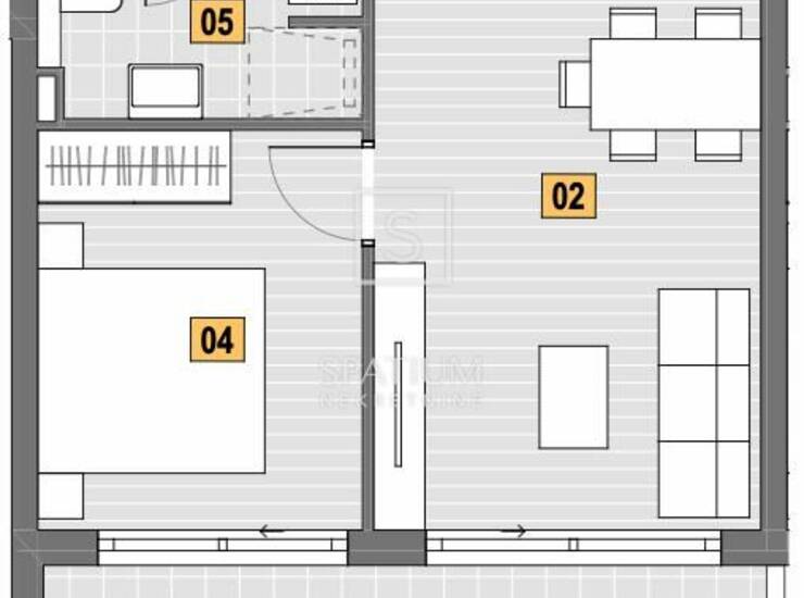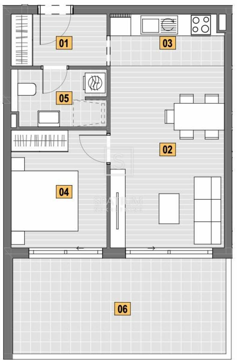 Stan površine 52,07m2, nalazi se na prvom katu, sastoji se od degažmana, kuhinje, dnevnog boravka s blagovaonicom, spavaće sobe, kupaone i balkona.