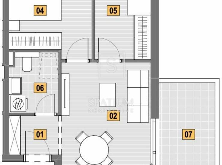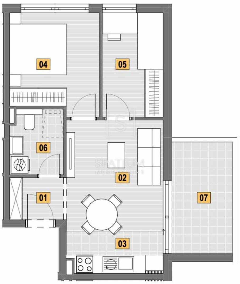Stan površine 48,73m2, nalazi se na prvom katu, sastoji se od degažmana, kuhinje, dnevnog boravka s blagovaonicom, dvije spavaće sobe, kupaone i balkona.