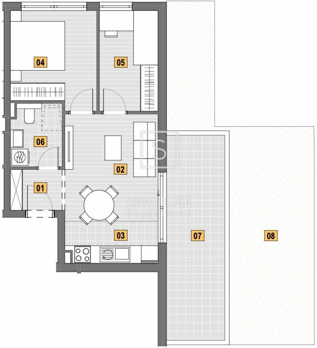 Stan površine 61,12 m2, nalazi se u prizemlju, sastoji se od degažmana, kuhinje, dnevnog boravka s blagovaonicom, dvije spavaće sobe, kupaone i balkona.