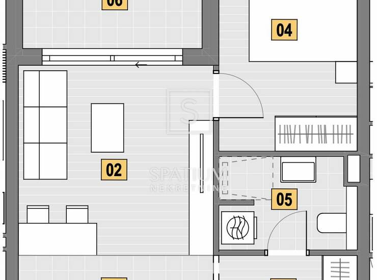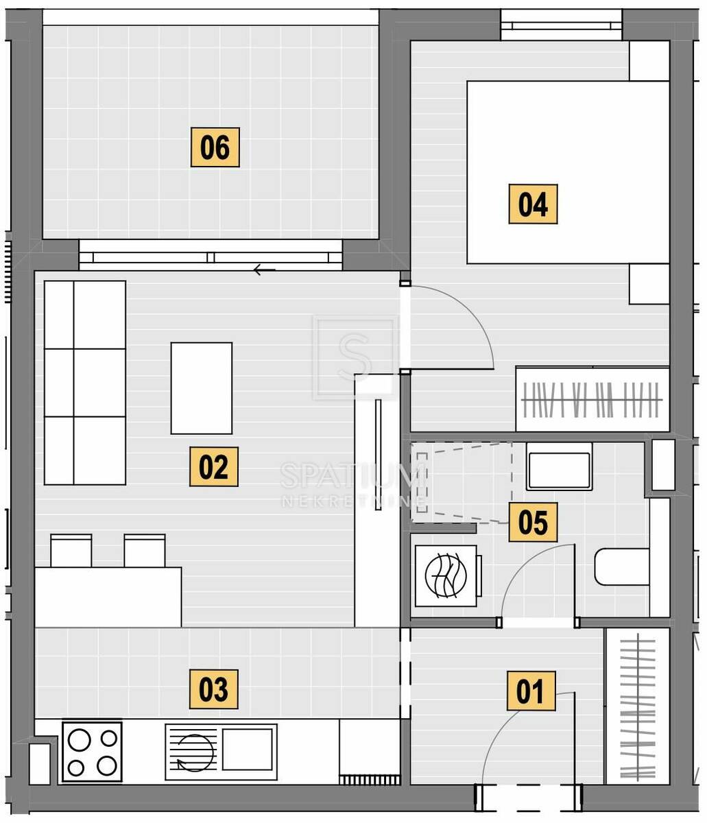 Stan površine 41,53 m2, nalazi u prizemlju, sastoji se od degažmana, kuhinje, dnevnog boravka s blagovaonicom, spavaće sobe, kupaone i lođe.