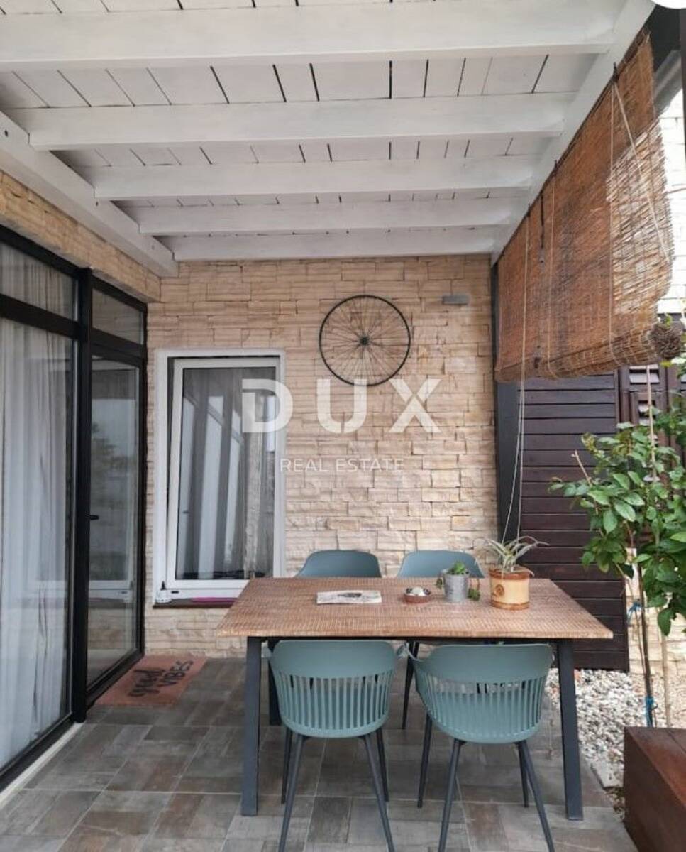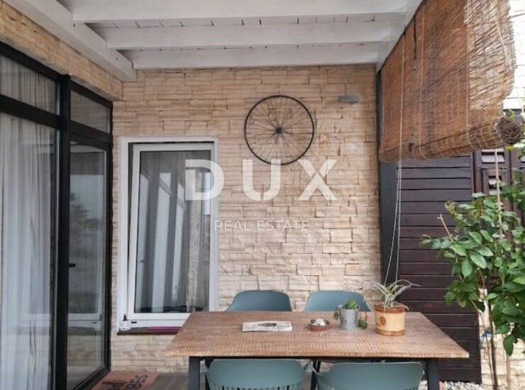Na prvom katu smješten je prostrani stan s velikom terasom, dvije spavaće sobe, modernom kuhinjom, blagovaonicom i kupaonicom. Ovaj svijetli i sunčani stan, s posebnim ulazom, očarat će vas svojim šarmantnim interijerom i pažljivo osmišljenim prostorom i odabranim detaljima.