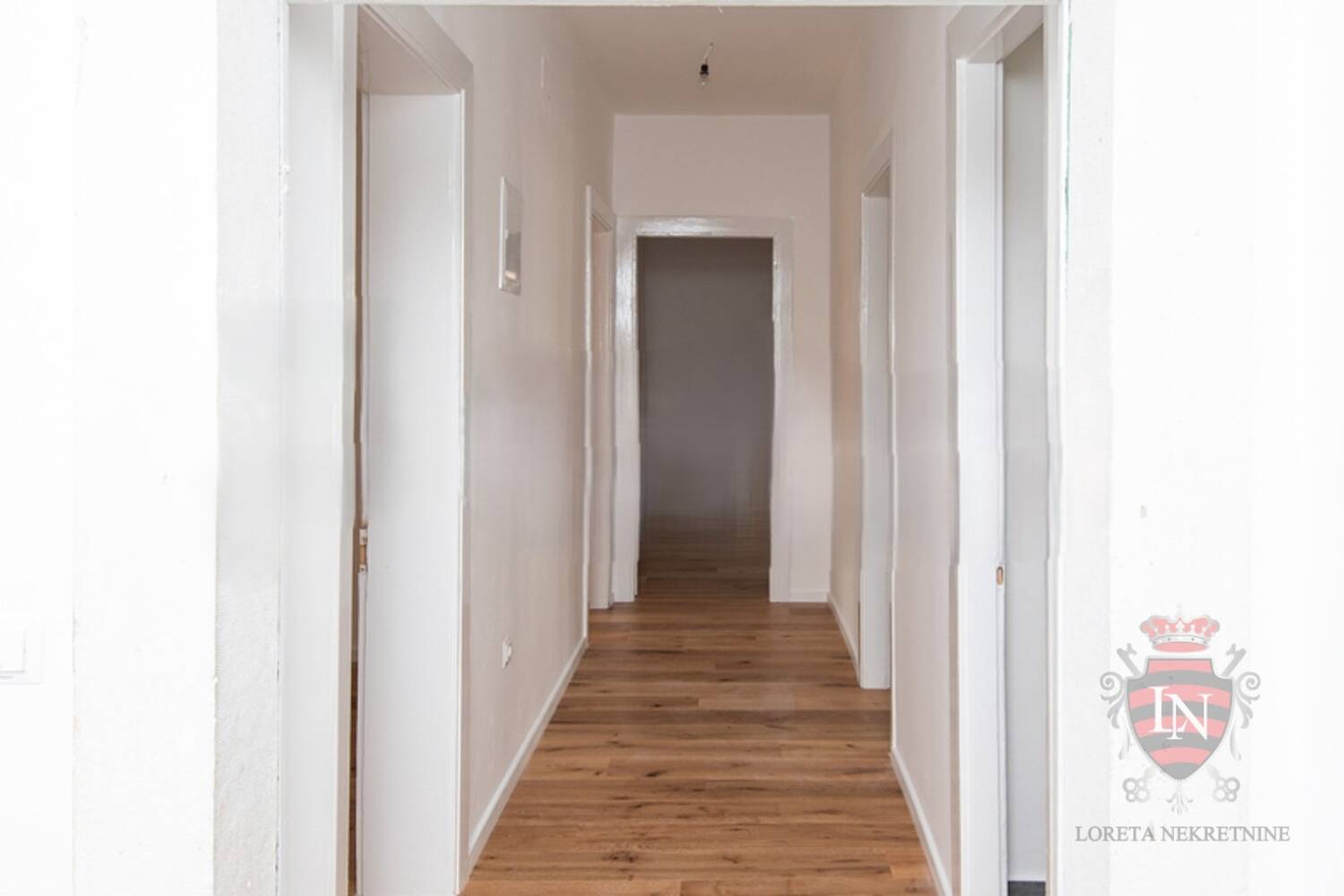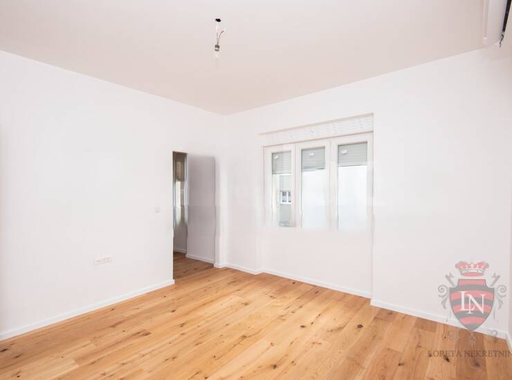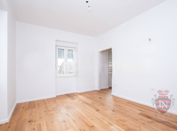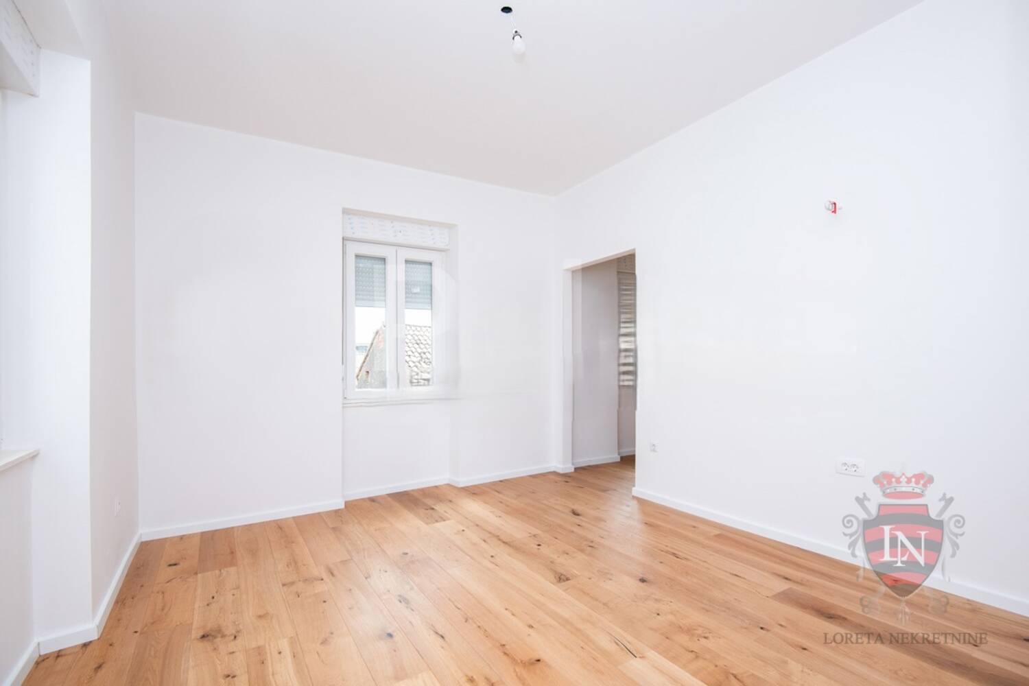 Na prodaju je kompletno renoviran stan, na prvom katu manje zgrade sa zasebnim ulazom na odličnoj lokaciji. Površine 67 m2, stan obuhvaća dvije spavaće sobe, kuhinju, dnevni boravak, kupaonicu, vešeraj, te hodnik. Ispod stepeništa je i malo spremište, a stanu pripada i kompletno potkrovlje s dodatnom neto površinom od 13 m2.