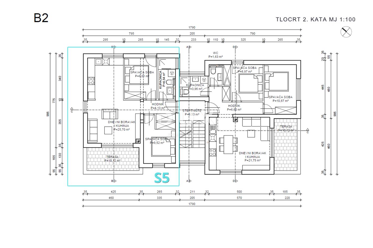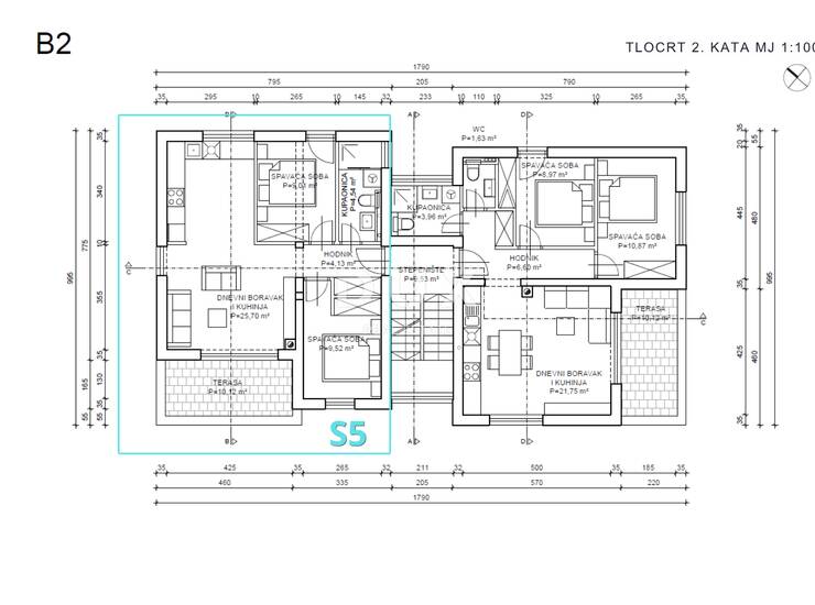 Stan S5 nalazi se na 2. (zadnjem) katu zgrade B2 (2. red uz more), ima 66,77 m² neto površine (63,20 m² unutarnje stambene površine) i južne je orijentacije.