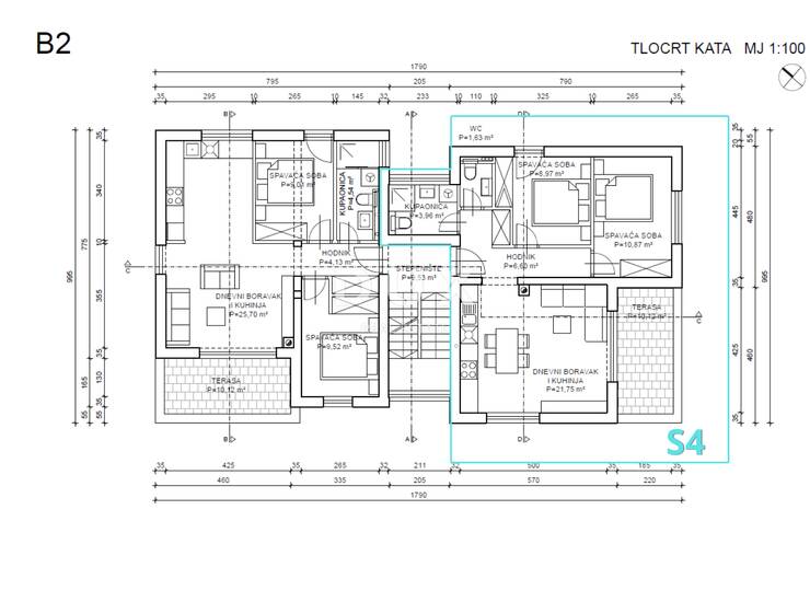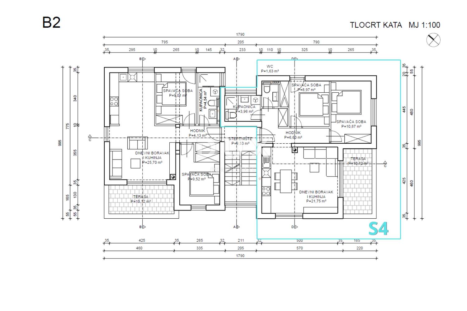 Stan S4 nalazi se na 1. katu zgrade B2 (2. red uz more), ima 67,65 m² neto površine (62,90 m² unutarnje stambene površine) i južne je orijentacije.