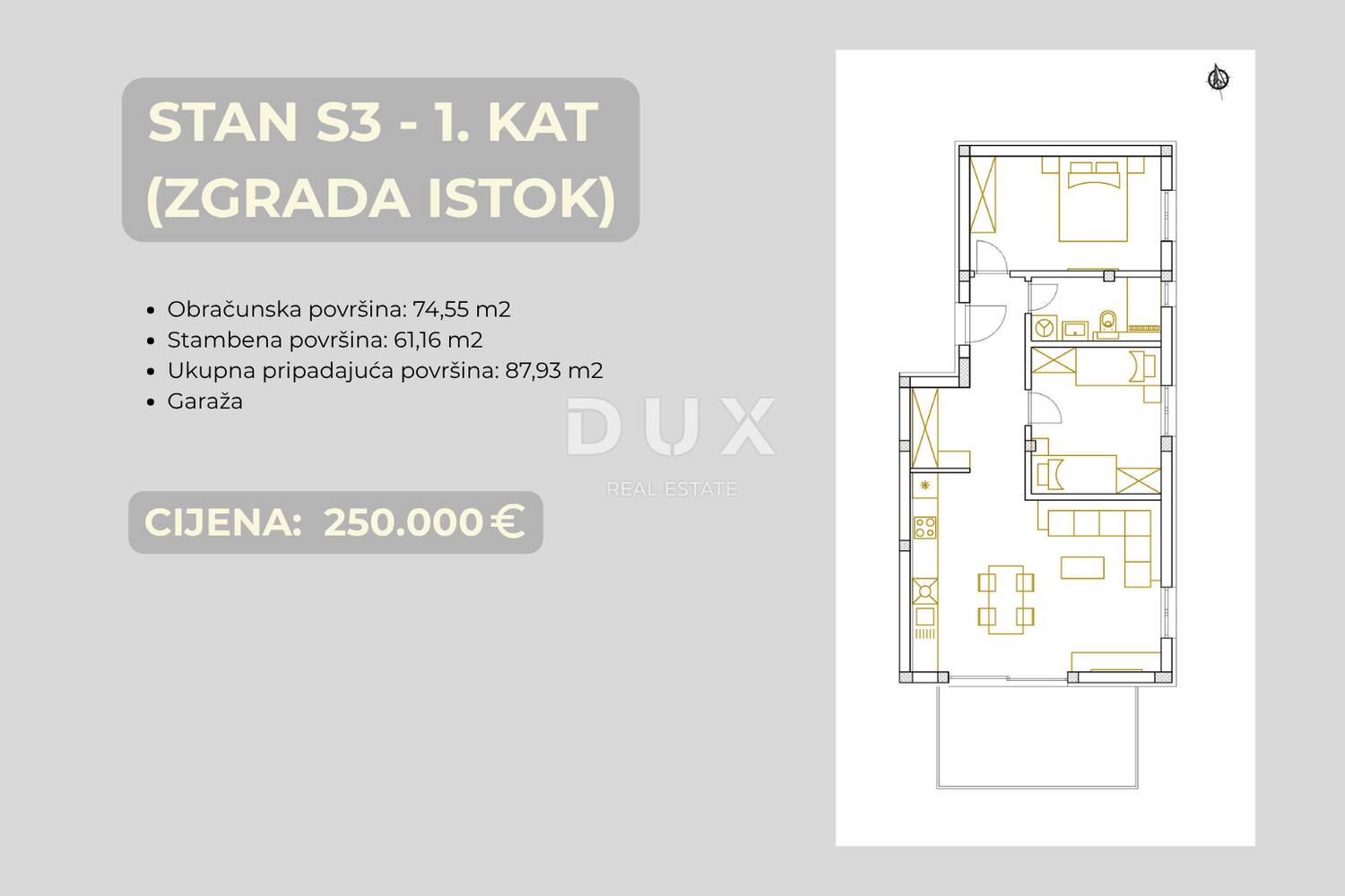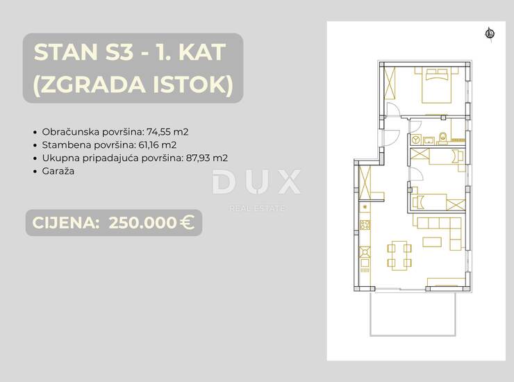 Stan S3 (ZGRADA ISTOK) smješten je na 1.katu, ukupne korisne površine 74,55 m², od čega 61,16 m² čini čista unutarnja stambena površina, orijentiran jug–istok osigurava obilje prirodnog svijetla tokom cijelog dana.