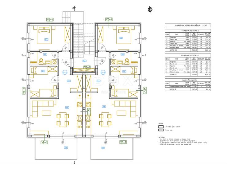 Projekt se sastoji od dvije manje zgrade sa ukupno 8 stanova (svaka zgrada po 4 stana) raspoređenih kroz prizemlje i dva kata, što znači manje susjeda i veću razinu privatnosti. U prizemlju su garaže i po jedan stan, na 1. katu po dva stana dok se na 2. katu nalaze penthousei s pogledom na more.
