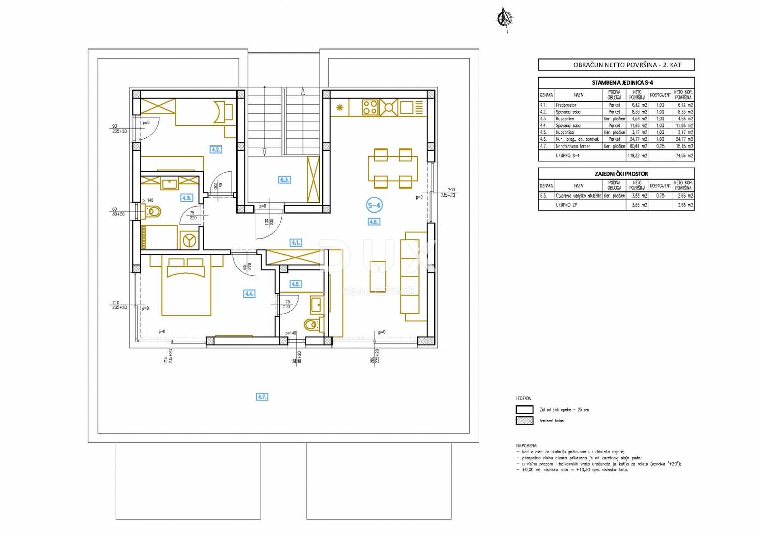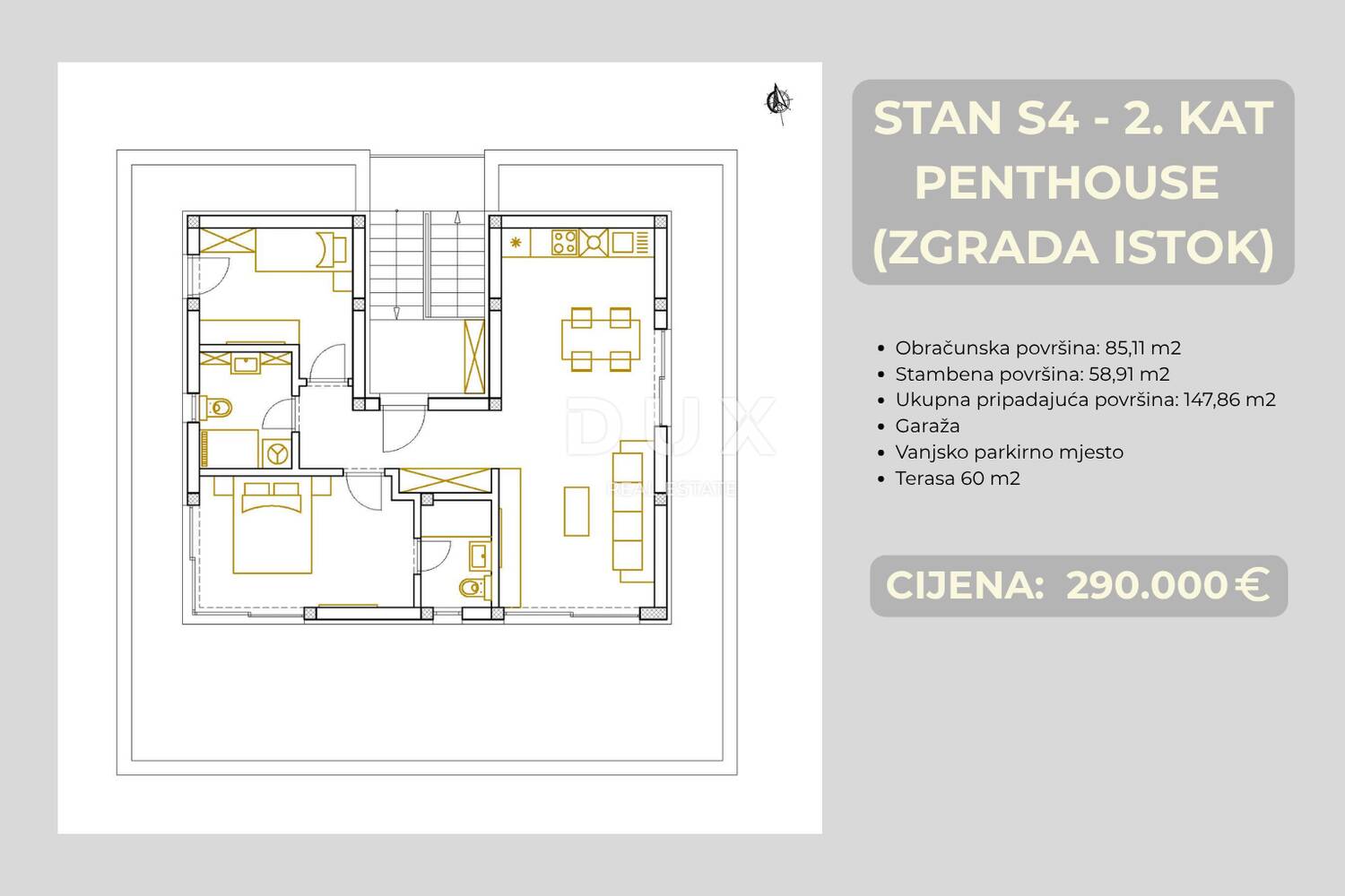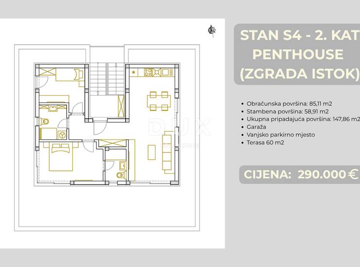 Stan S4 (ZGRADA ISTOK) je penthouse smješten na cijelom 2. katu zgrade. Ukupne je korisne površine 85,11 m², od čega 58,91 m² čini čista unutarnja stambena površina i orijentiran prema jugu što osigurava obilje prirodnog svjetla tijekom cijelog dana.