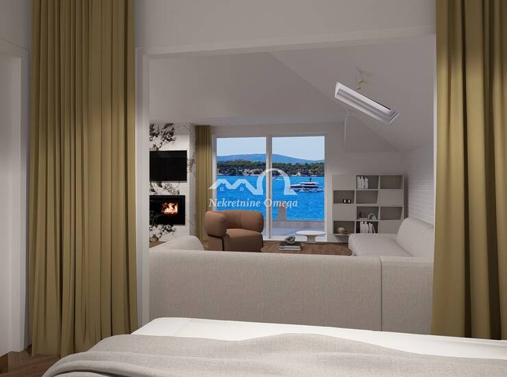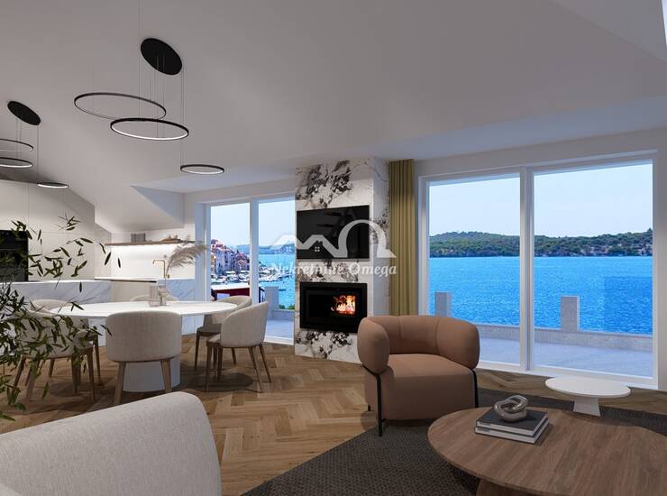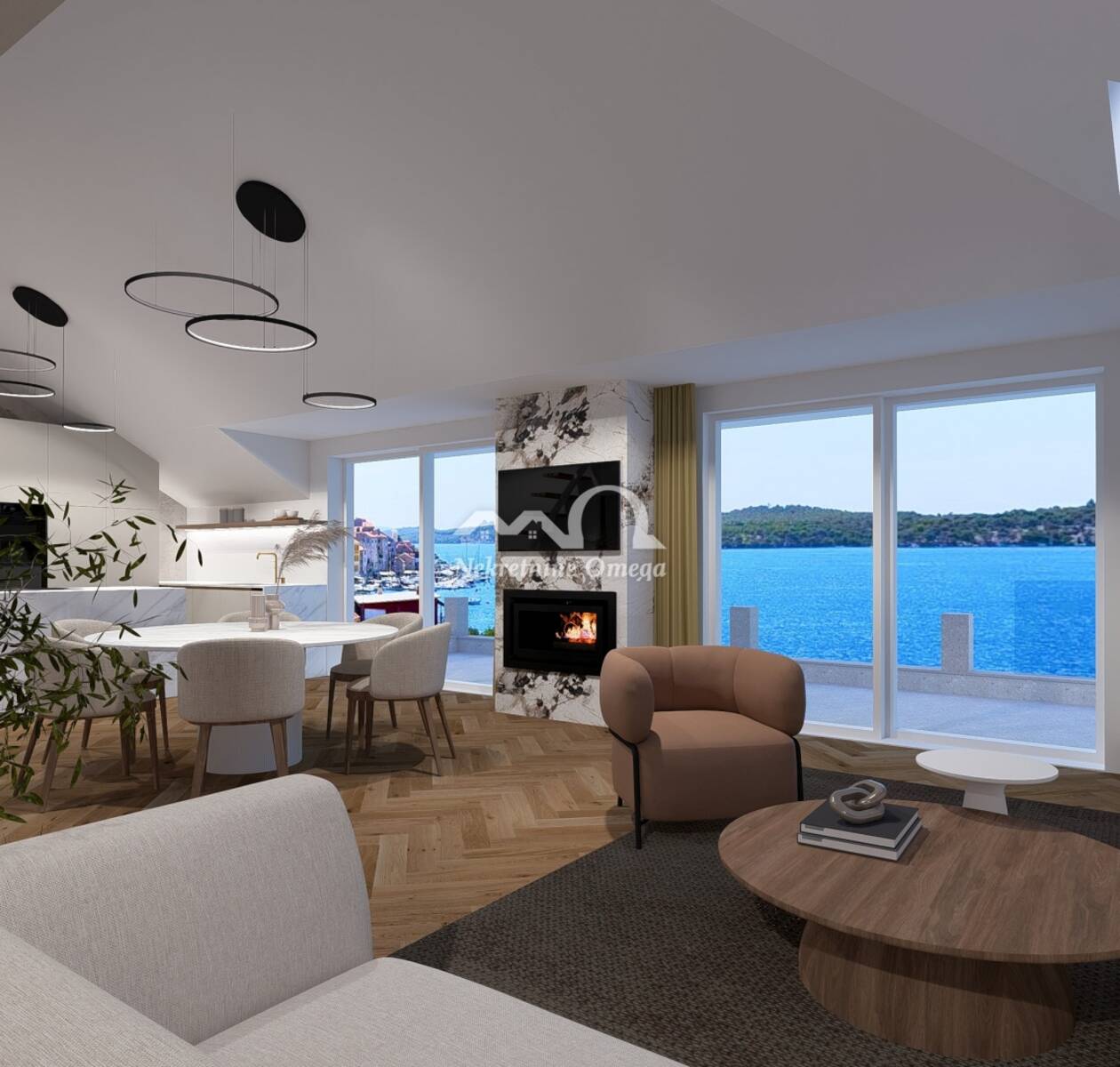 Prodaje se luksuzni stan površine 138 m² u potpuno uređenoj, modernoj zgradi s liftom, na vrhunskoj lokaciji – samo 50 metara od mora. Zgrada je orijentirana južno, što svim stanovima omogućuje nesmetan pogled na more, šibenski kanal, tvrđavu i stari grad.