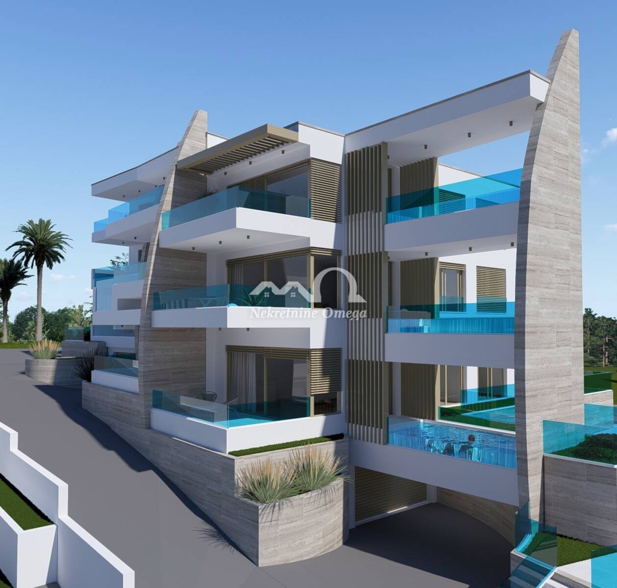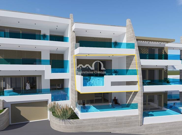 Prodaje se luksuzni dvosobni stan površine 91,33 m², smješten na 1. katu ekskluzivne novogradnje na samo 20 metara od mora u mirnom mjestu Grebaštica, nadomak Šibenika.