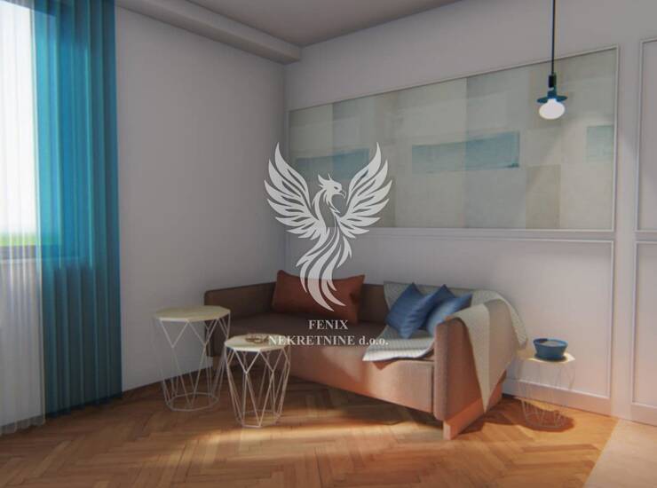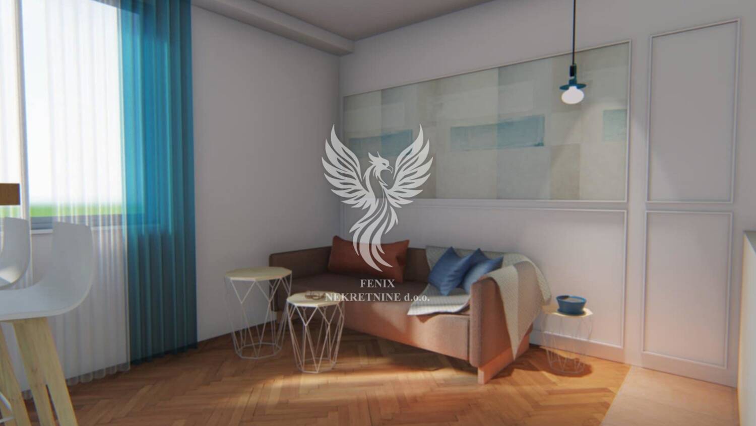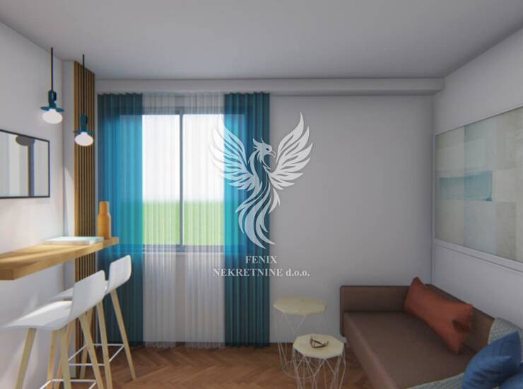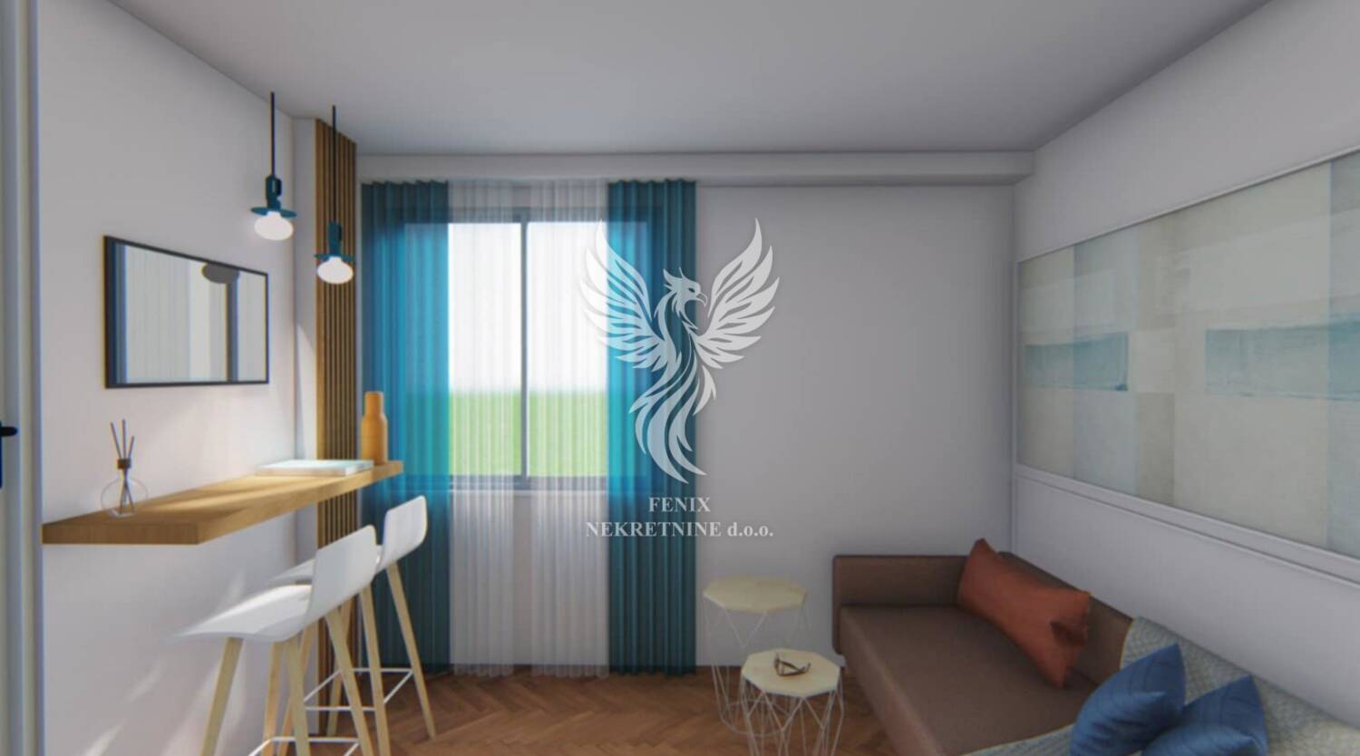 . 2. Apartman - Sadržaj (Renderi dizajna Luce): Multifunkcionalni Prostor: Dizajnerski uređen prostor s naglaskom na modernu estetiku (dizajn Luce). Kutak za rad/blagovanje: Zidni šank/stol s dvije moderne barske stolice, TV i dizajnerska rasvjeta. Dnevni Boravak: Udoban kau