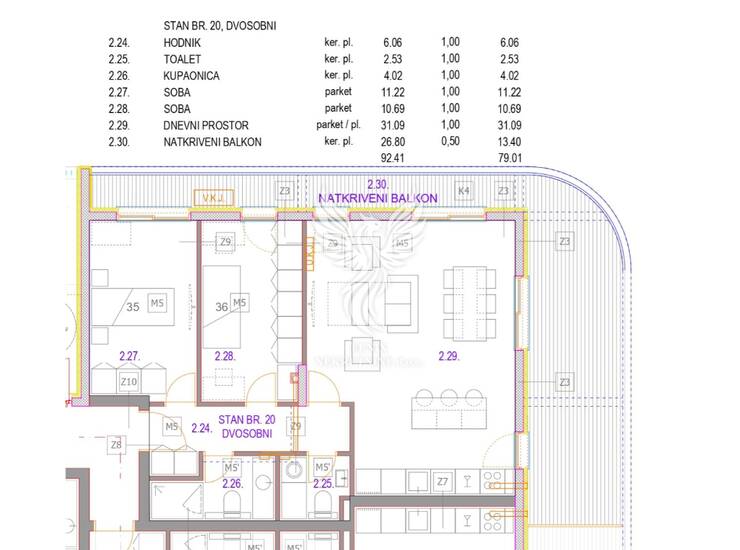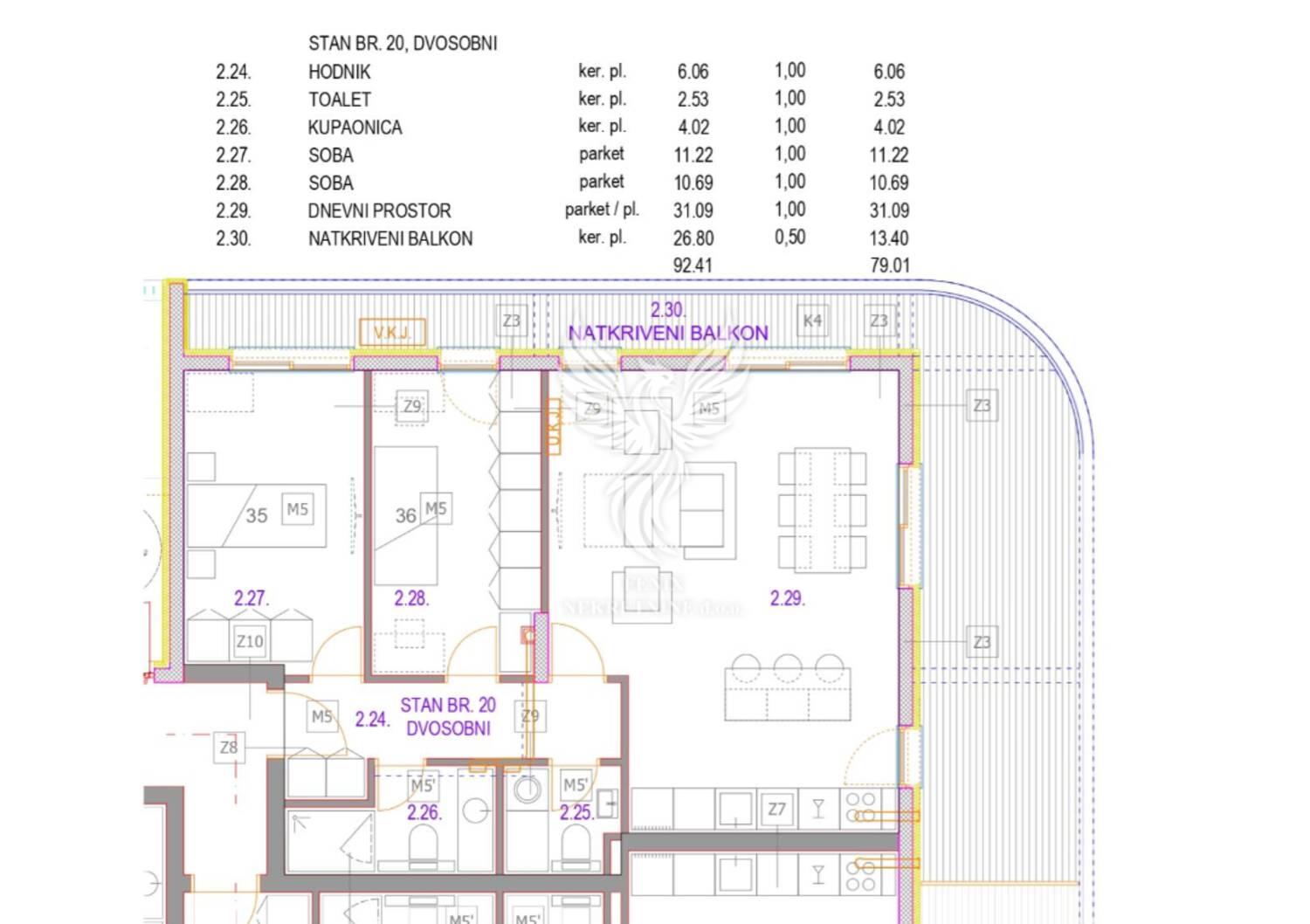 Stan se sastoji od ulaznog hodnika koji povezuje sve prostorije, odvojenog WC-a, kupaonice, tri spavaće sobe, te prostranog dnevnog prostora koji objedinjuje dnevni boravak, kuhinju i blagovaonicu. Iz dnevnog boravka izlazi se na natkriveni balkon, idealan za boravak na otvorenom tijekom cijele godine. Raspored je izuzetno funkcionalan, s jasno odvojenim dnevnim i spavaćim dijelom stana, što osigurava privatnost i komfor.