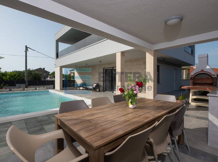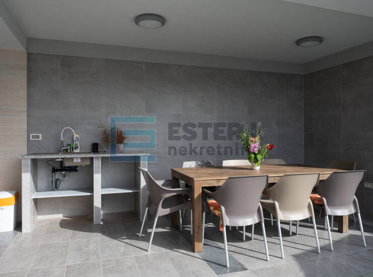 - Prizemlje: prostrani dnevni boravak i blagovaonica s izlazom na bazen i prostor za roštilj