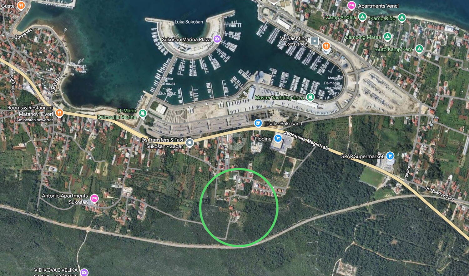 Ovo građevinsko zemljište nalazi se u Sukošanu, jednom od najpoželjnijih obalnih mjesta u zadarskoj regiji, svega nekoliko minuta južno od grada Zadra.