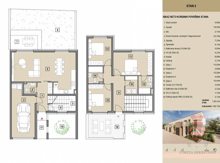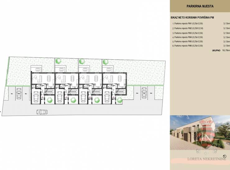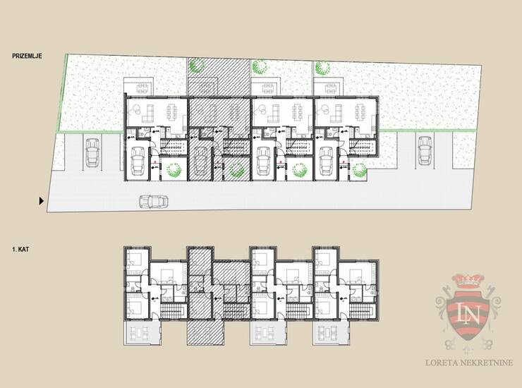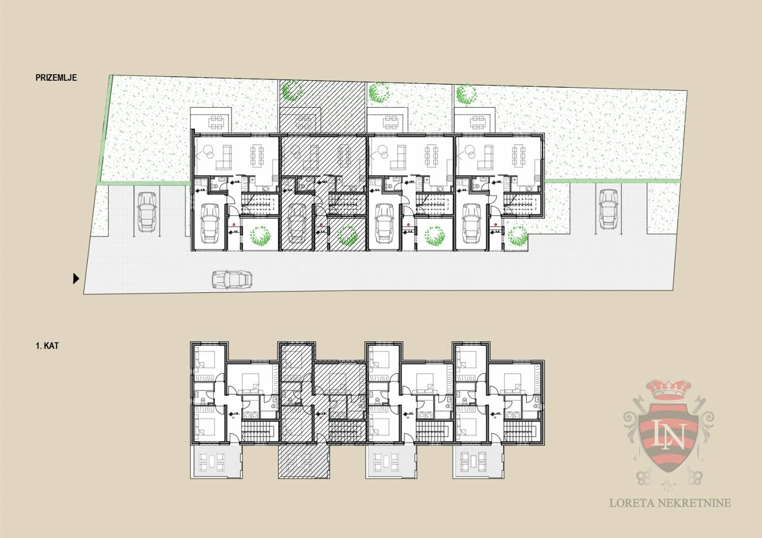 U prizemlju su osim stambenih jedinica predviđene 4 garaže u sklopu jedinica.