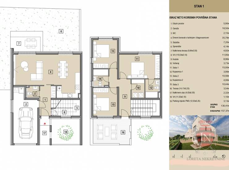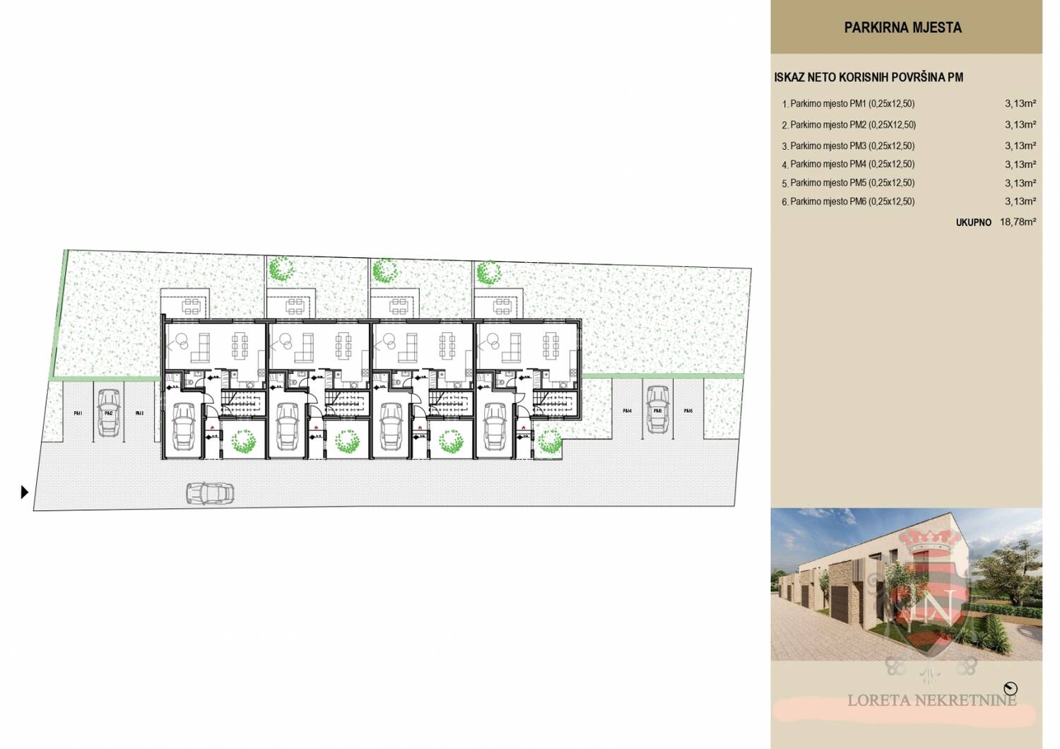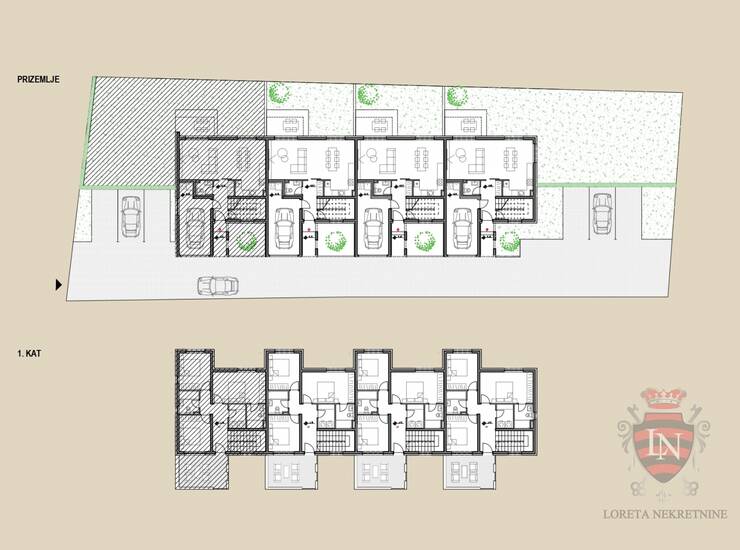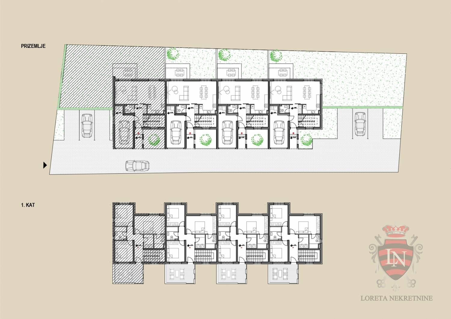 U prizemlju su osim stambenih jedinica predviđene 4 garaže u sklopu jedinica.