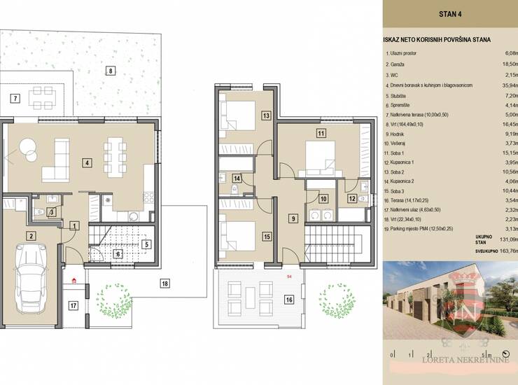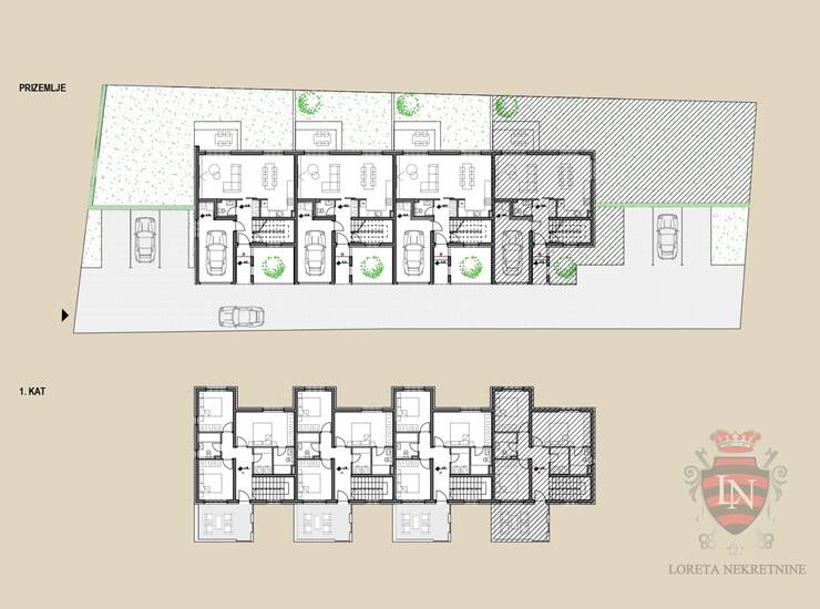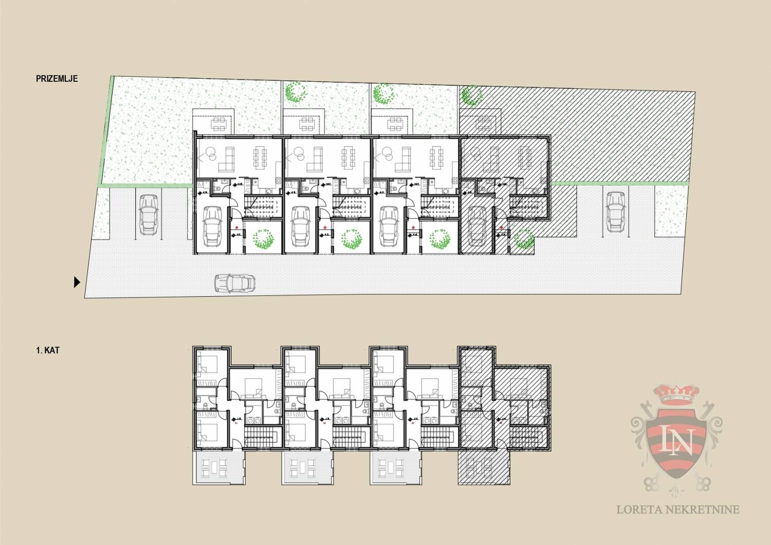 U prizemlju su osim stambenih jedinica predviđene 4 garaže u sklopu jedinica.