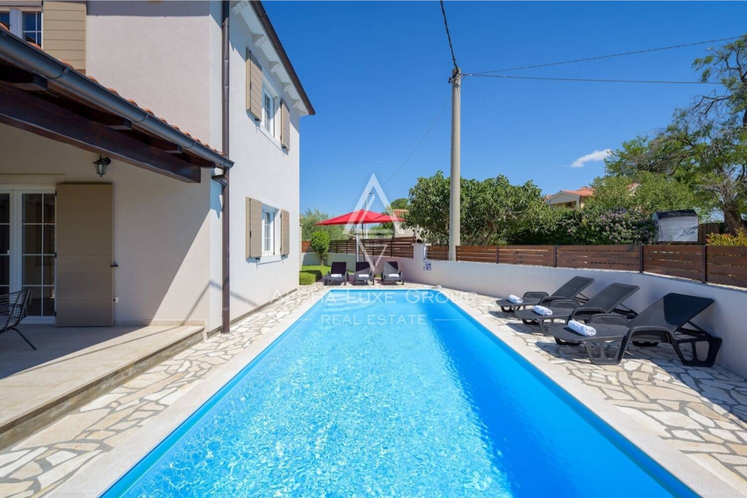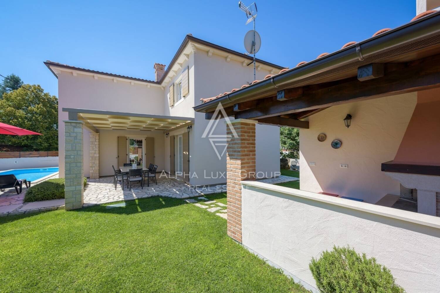 Vanjski prostor osmišljen je za uživanje i opuštanje, s bazenom dimenzija 8 x 4 m, sunčalištem te dodatnim sadržajima poput roštilja i priključka za vodu, uz mogućnost uređenja potpuno opremljene ljetne kuhinje. Nekretnina također uključuje vanjski toalet i dodatno spremište.