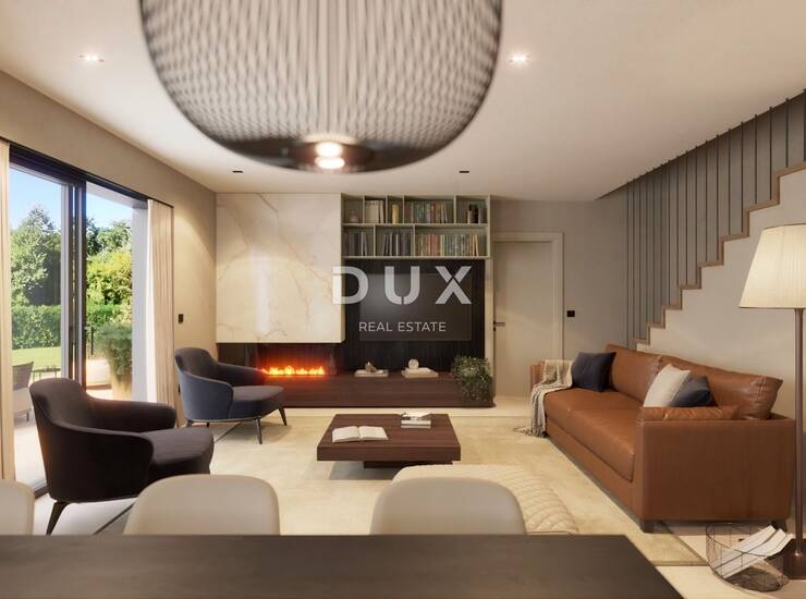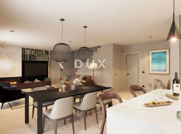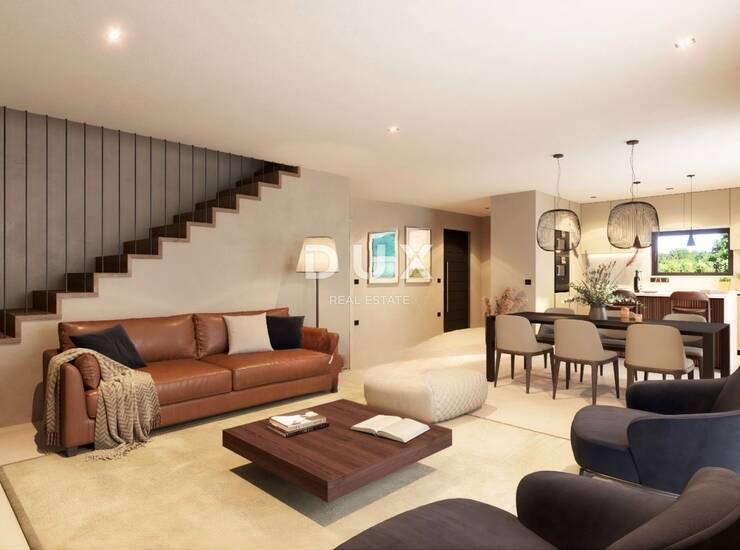 Kuća suvremenog iskoraka u bezvremenskoj arhitekturi s naglaskom na funkcionalnost i estetiku se oblikovno i koloristički uklopa u naselje i krajolik, razvedena je na dvije elegantno namještene i kvalitetno opremljene etaže fun