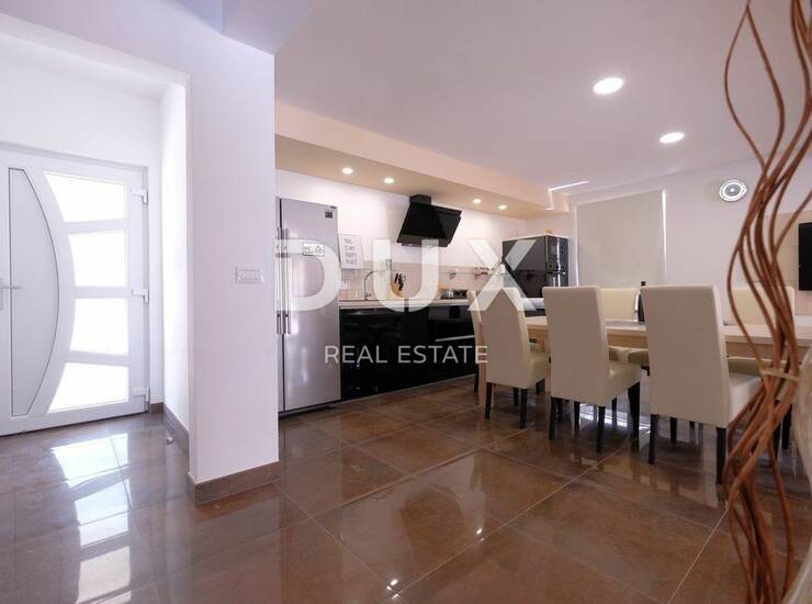 Ulaskom u kuću dočeka nas predivan otvoreni prostor u kojemu su se smjestili prostrana i moderno opremljena kuhinja, blagovaona i prostrani dnevni boravak. Iz dnevnog boravka proteže se izlaz kroz staklenu stijenku prema natkrivenoj terasi i pogled oprema bazenu i zelenilu. Jednako tako na prizemnoj etaži smjestila se jedna od spavaćih soba te kupatilo.