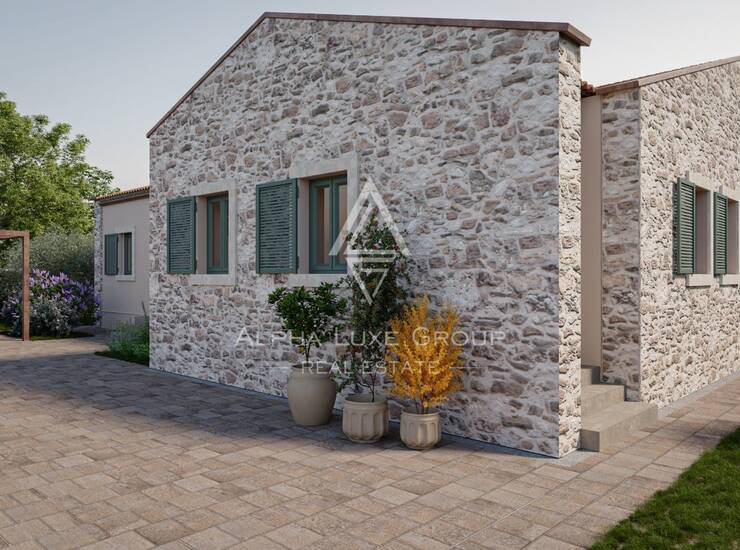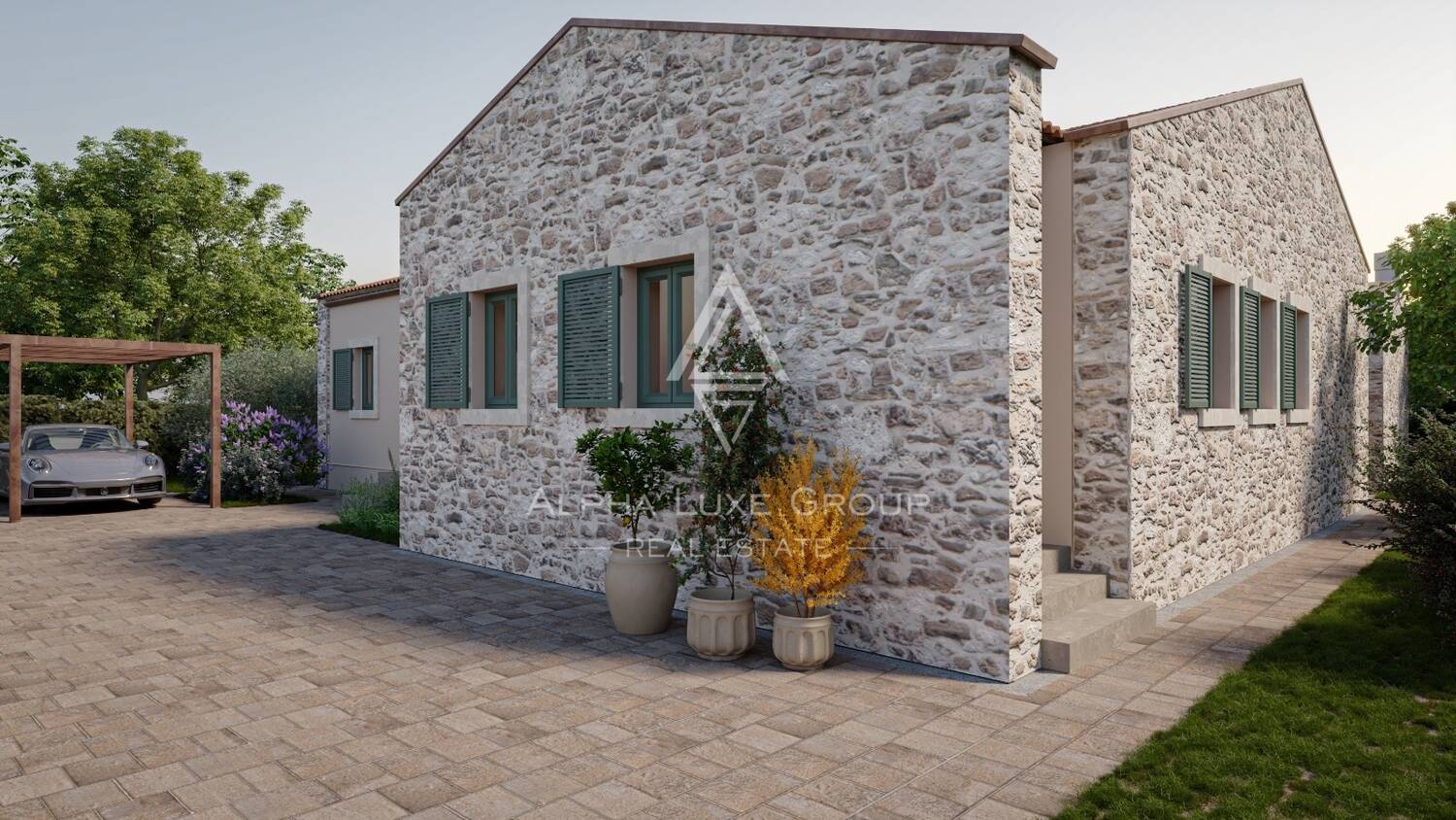 Kuća je planirana moderna, s daškom mediterana, stolarijom u boji kadulje i lijepim kamenim elementima na kući i okućnici te drvenim pergolama.