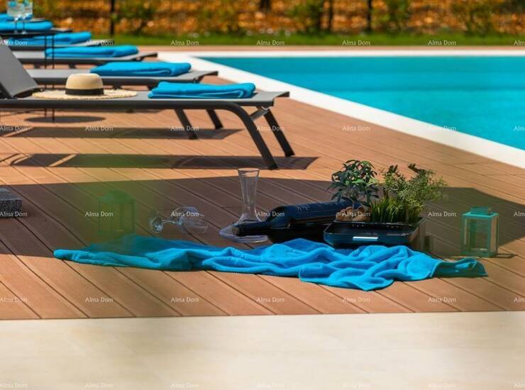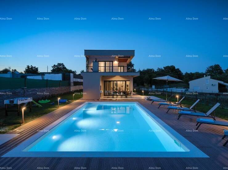 Okolica Svetvinčenta odnosno kuća se nalazi u mjestu okruženo zelenilom i vinogradom . Samo nekoliko kilometra od centra Svetvinčenta smjestila se ova moderna, elegantna vila s prostranom okućnicom veličine 846m2.