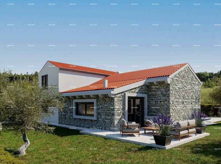Svetvičenat. Građevinska parcela od 545 m² s dozvolom za gradnju kuće s bazenom. Na parceli su predviđeni kuća s prizemljem i katom, vanjski bazen, spremište, te dva parkirna mjesta. Priključci za struju i vodu su osigurani.