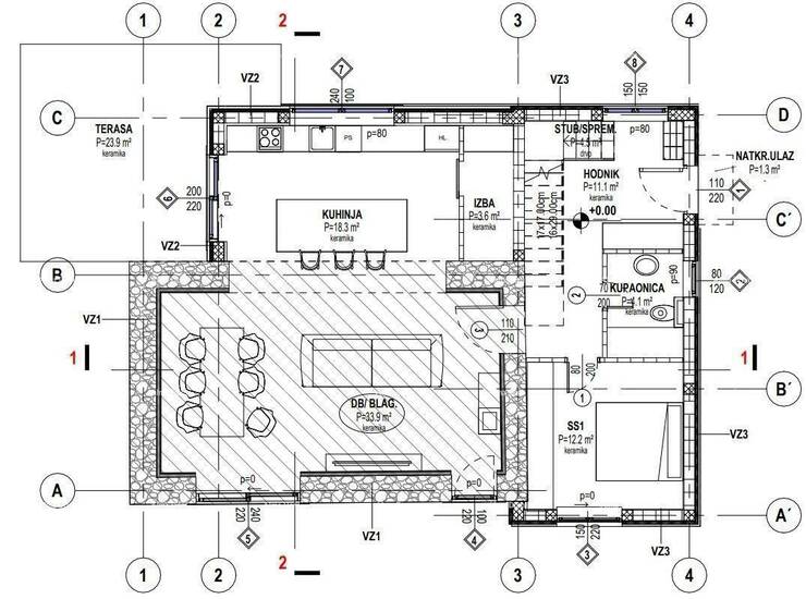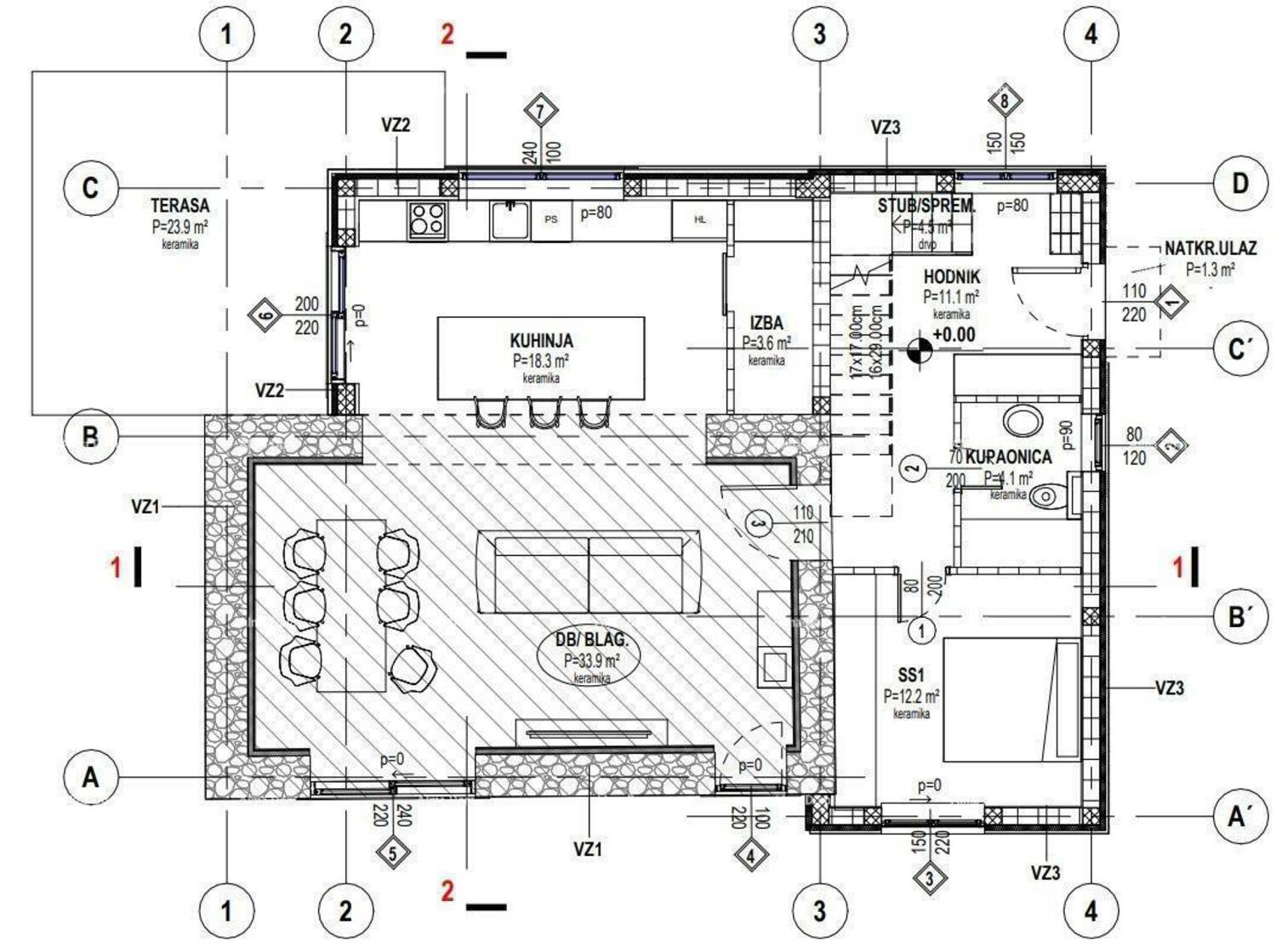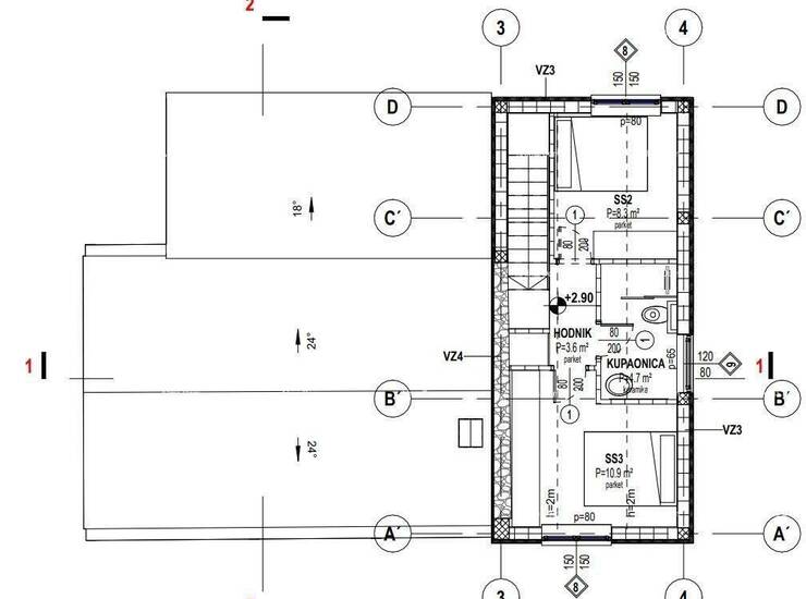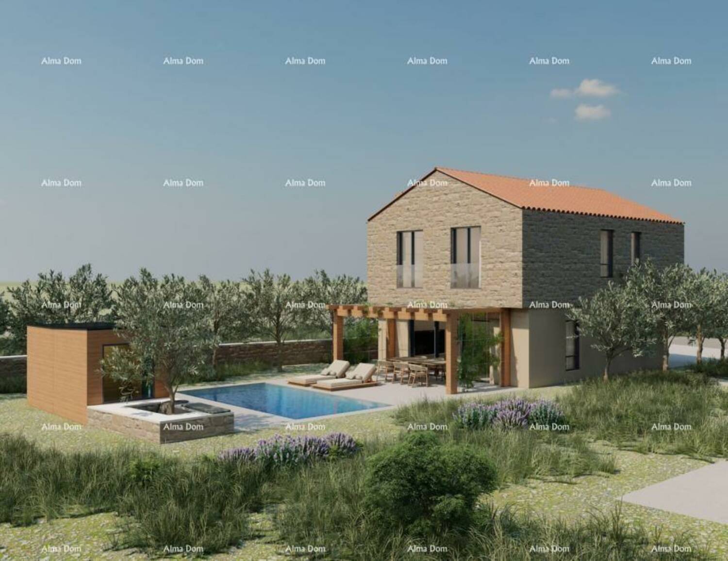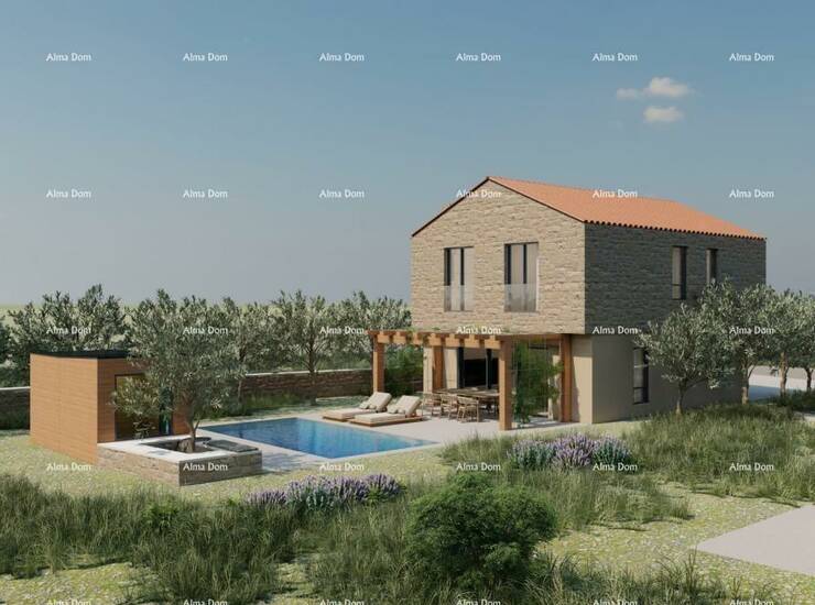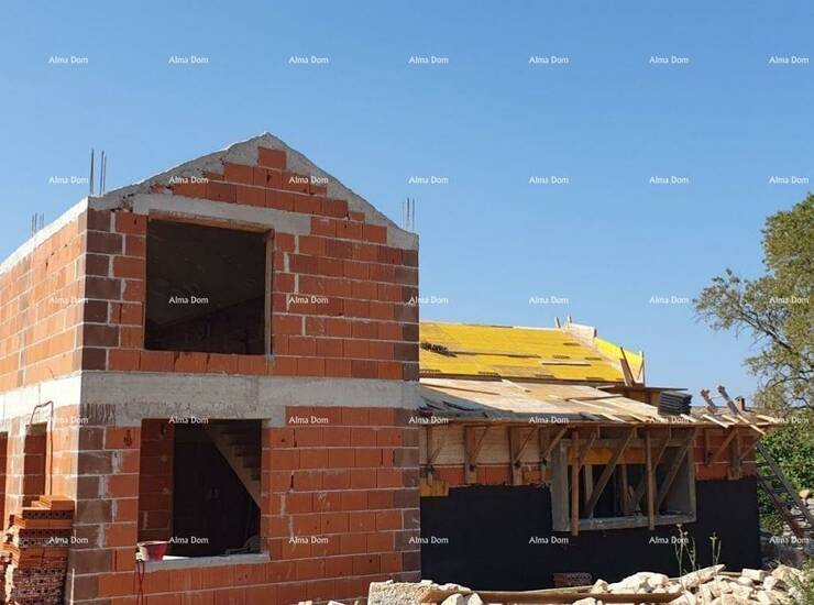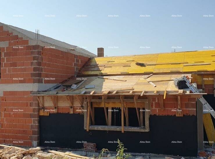Vodnjan. Kuća u izgradnji s bazenom, smještena na mirnoj lokaciji na kraju sela. Kuća se sastoji od prizemlja (dnevni boravak, blagovaonica i kuhinja kao open space, spavaća soba, kupaonica, ostava) i kata (dvije spavaće sobe i kupaonica). Vanjska terasa iznosi 23 m², a bazen 28 m². Kuća ima pristup s javnog puta i predviđeno grijanje na dizalicu topline.