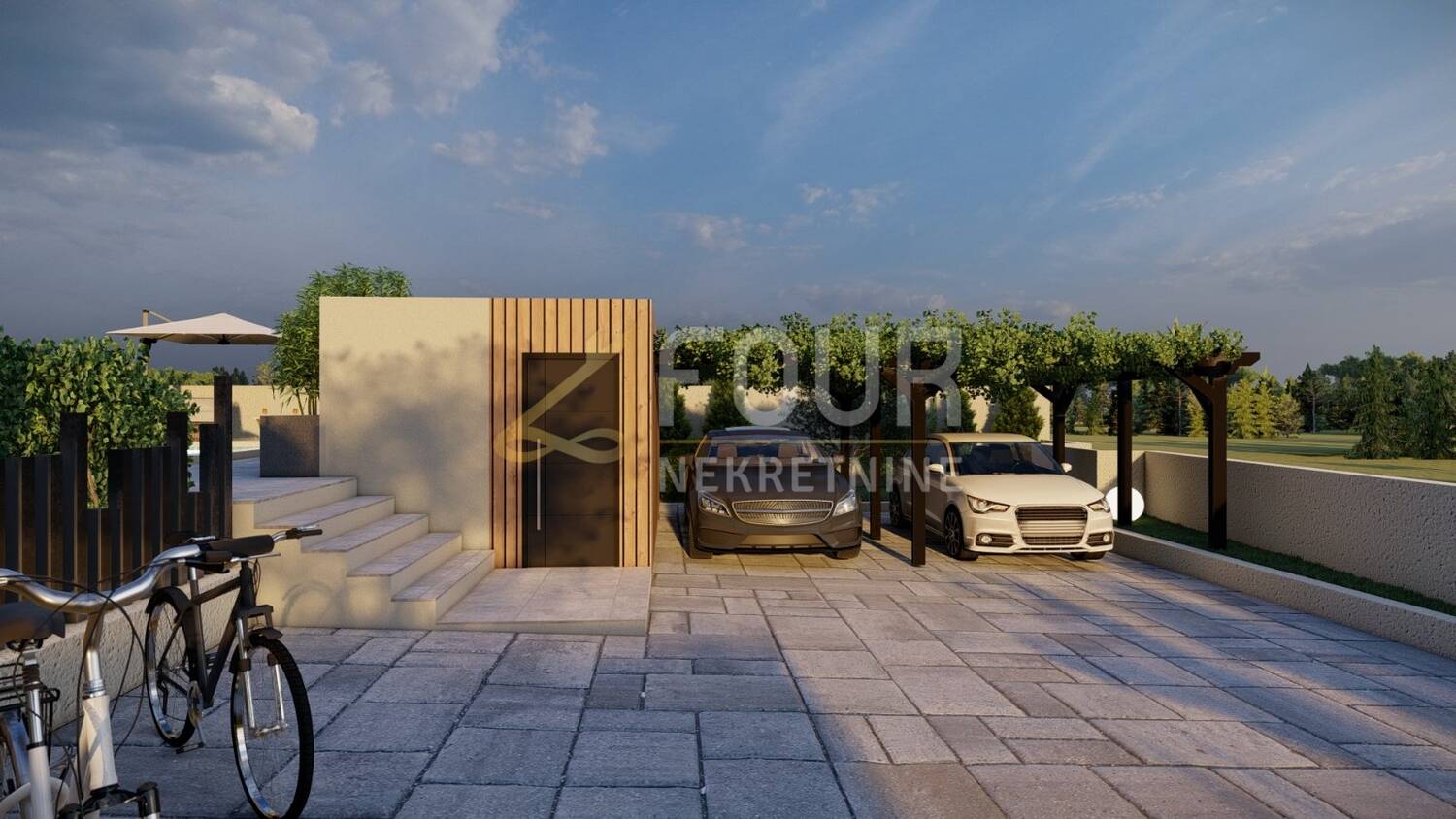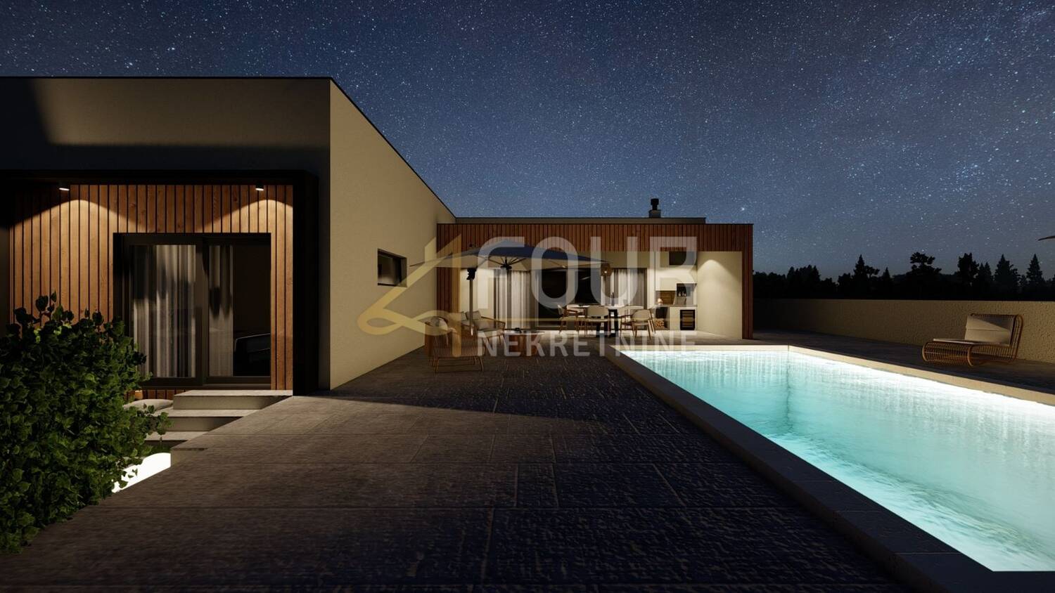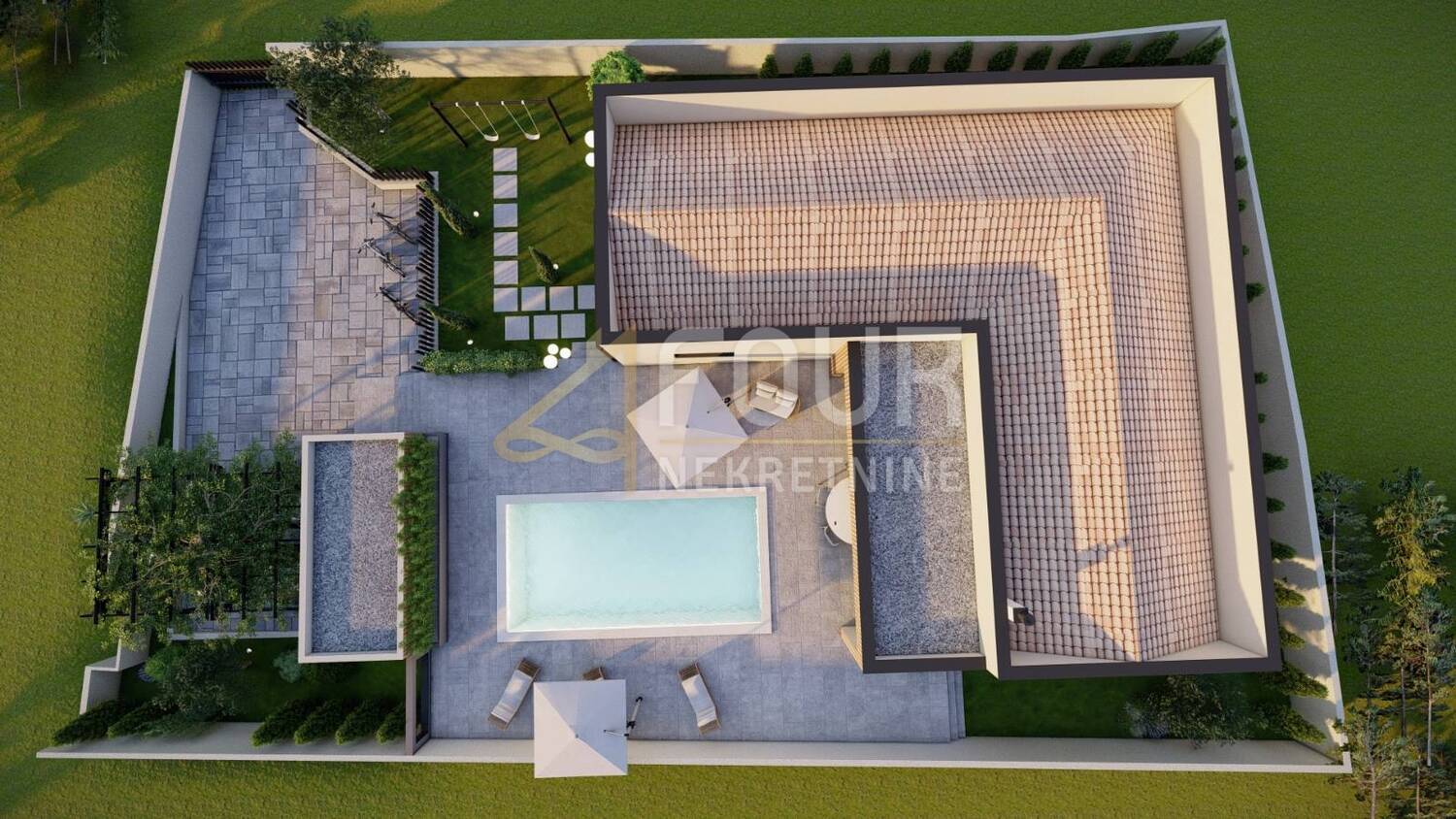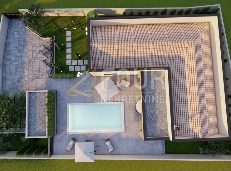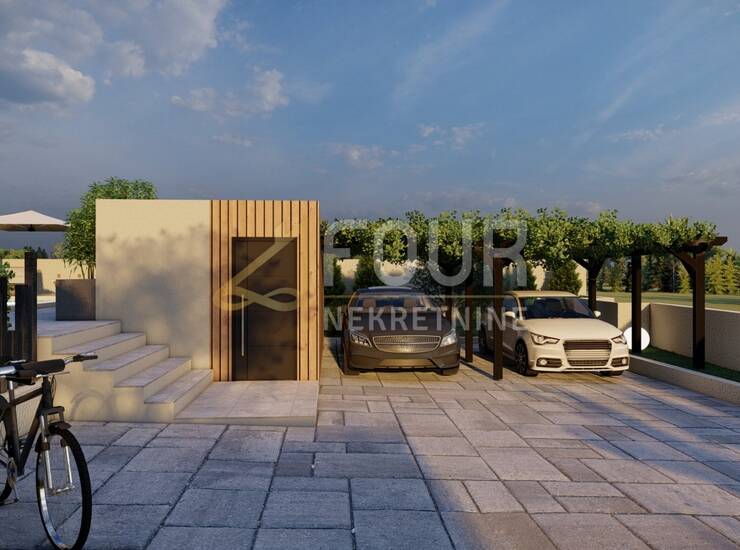 Unutrašnjost je zamišljena kao prostran i funkcionalan dom s četiri spavaće sobe, svaka s vlastitom kupaonicom, velikim dnevnim boravkom i kuhinjom te izlazom na natkrivenu terasu. U planu je podno grijanje i aluminijska stolarija, a cijeli vanjski prostor osmišljen je za potpunu privatnost i uživanje. Uz bazen se nalazi ljetna kuhinja, vanjski tuš te dio predviđen za dječje igralište. Osigurana su i dva natkrivena parkirna mjesta.