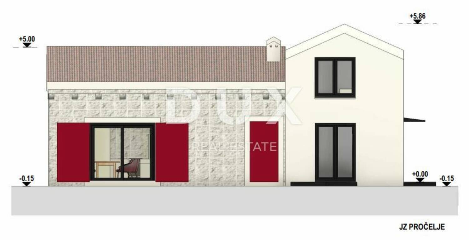 Kuća je trenutno u fazi izgradnje - predviđena je izgradnja samostojeće stambene građevine, prizemlje i kat, pomoćnih građevina - bazen s bazenskom tehnikom, sabirna jama, 2 parkirna mjesta. Kuća se nalazi na kraju sela u slijepoj ulici, parcela je površine 614m2, kuća neto površine 111m2. Ima pristup s javnog puta, sa 3 strane je omeđena suhozidima.