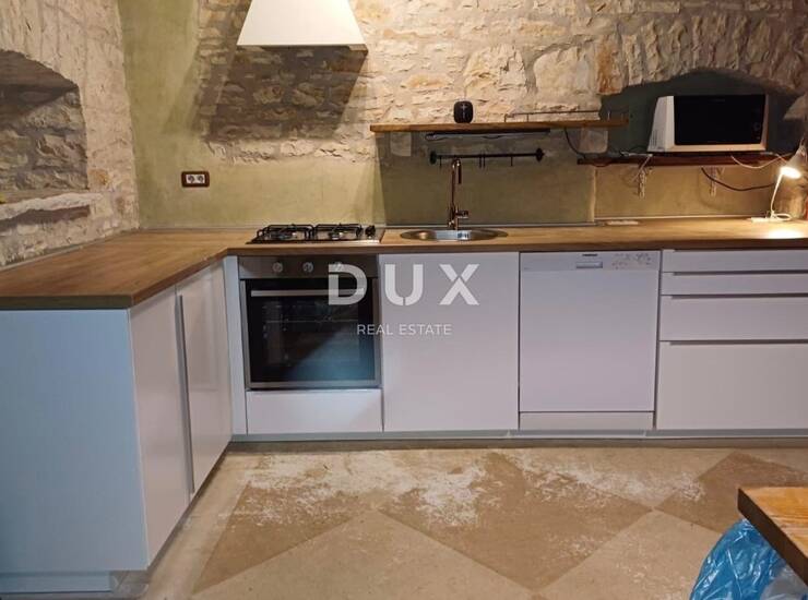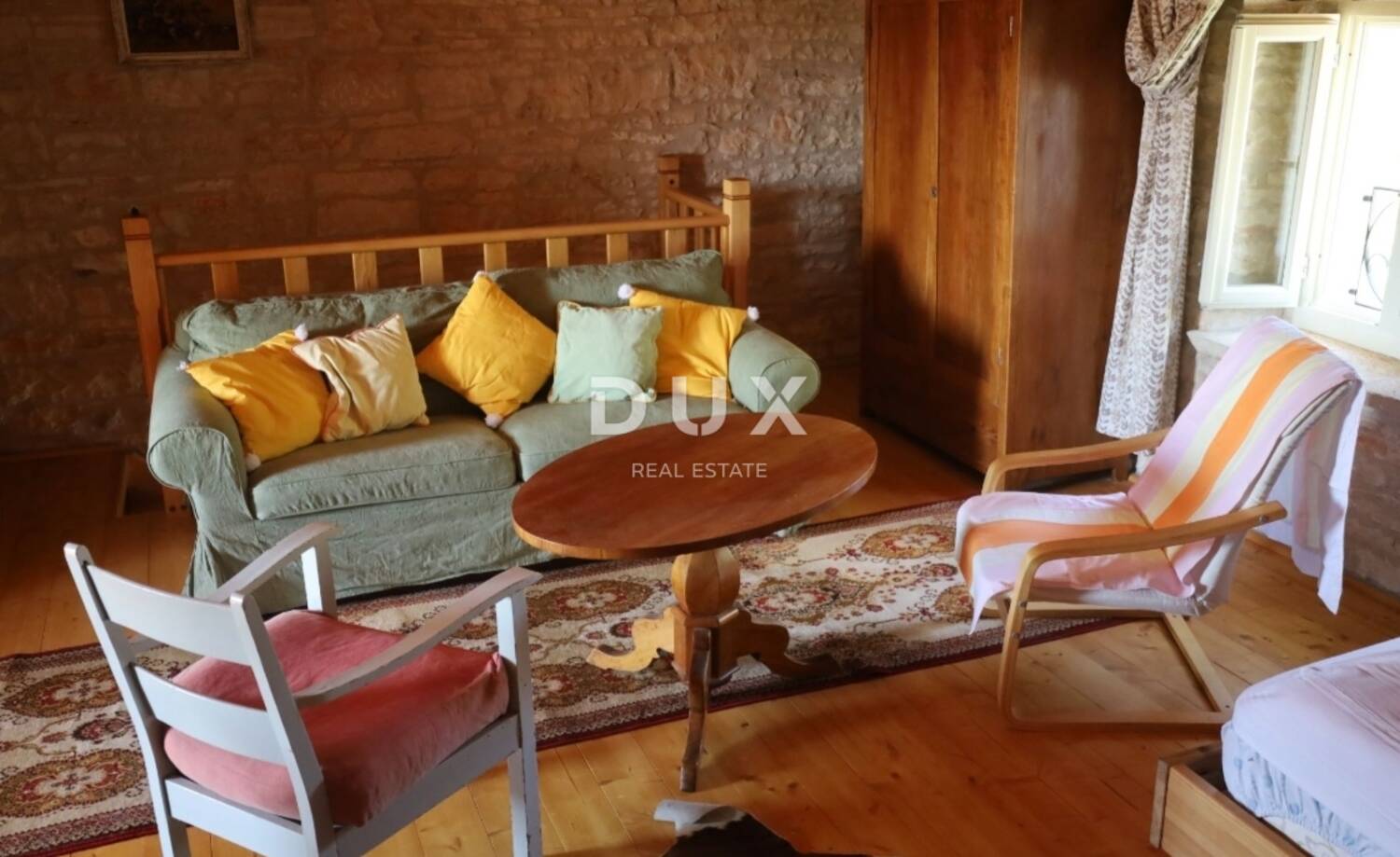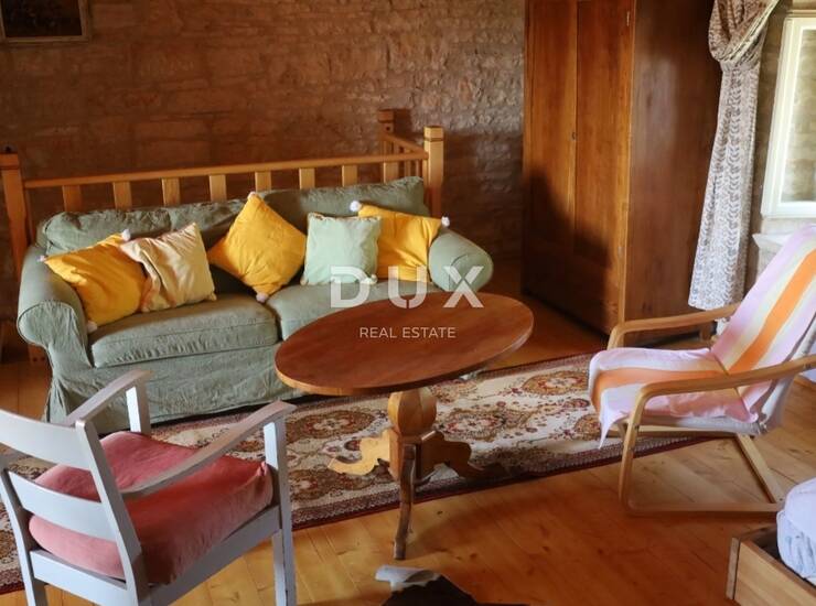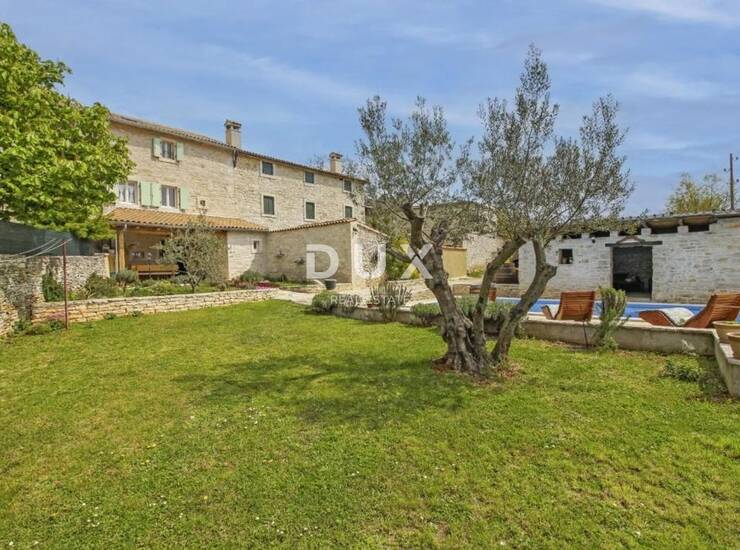 Upravo ovdje na zemljištu površine 660 m2, smjestila se prekrasna autohtona kamena kuća s bazenom. Nalazi se u malom selu, na mirnoj lokaciji. Površina kuće je 136 m2, nalazi se u nizu a proteže se kroz prizemlje i dvije etaže. U prizemlju se smjestila kuhinja sa blagovaonicom i dnevnim boravkom po konceptu open space te jedna kupaonica. Unutarnje stepenice povezuju kat kuće na kojem se nalaze dvije spavaće sobe te jedna kupaonica, dok se na drugoj etaži potpuno otvorenog tipa smjestila prostrana spavaća soba sa jednom kupaonicom.