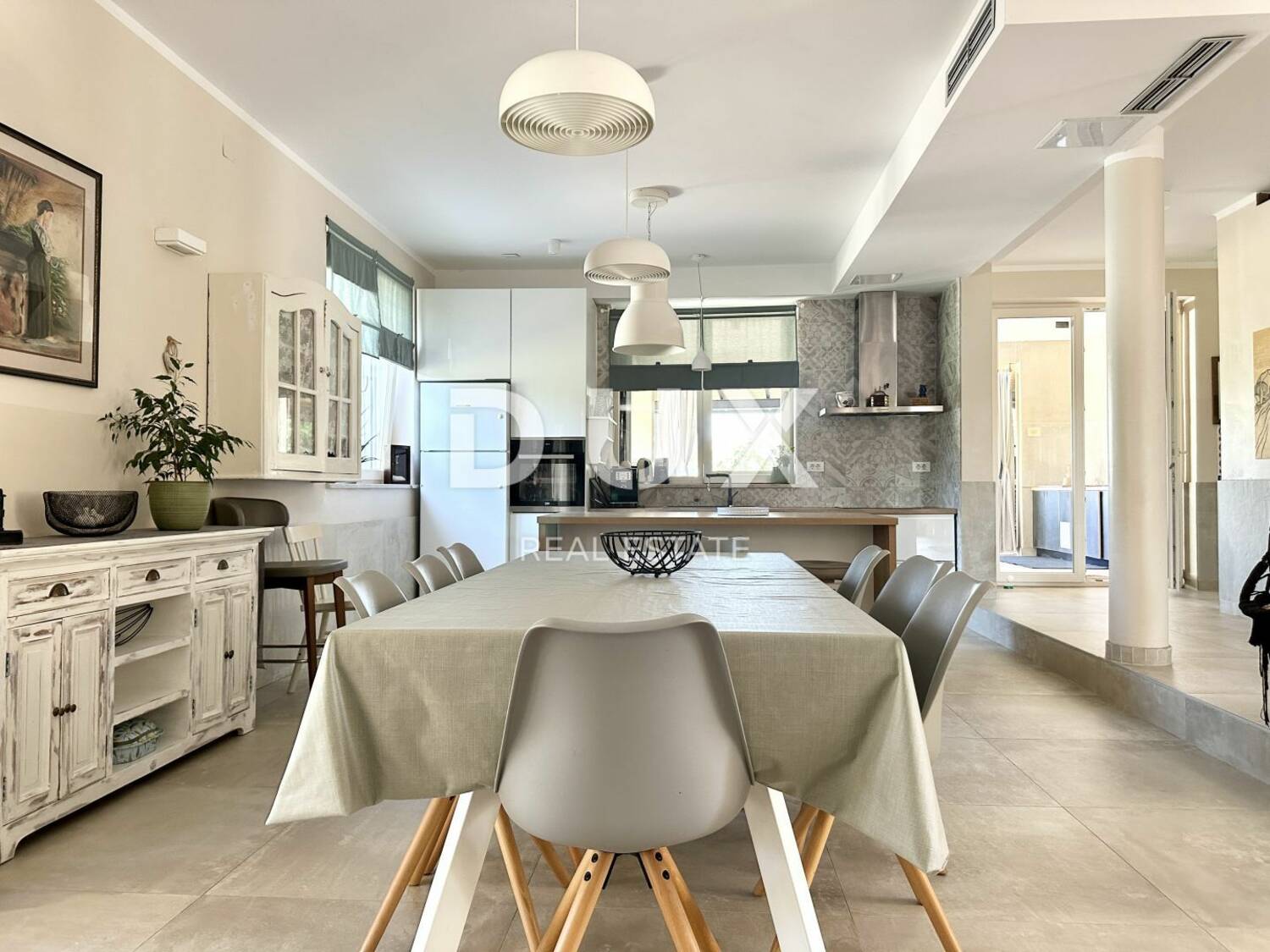 U prizemlju se nalazi elegantan dnevni boravak sa direktnim izlazom na terasu, vrhunski opremljena kuhinja i jedna spavaća soba. Tu se nalaze također dva natkrivena prostora gdje se nalaze sofe za odmor i stol za objedovanje, vanjska kuhinjska jedinica sa roštiljem na drva i plin. Uz veliki bazen površine 72 m2 nalazi se sunčalište s ležaljkama, te uz njega travnata površina za dječje ak