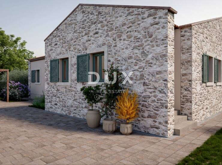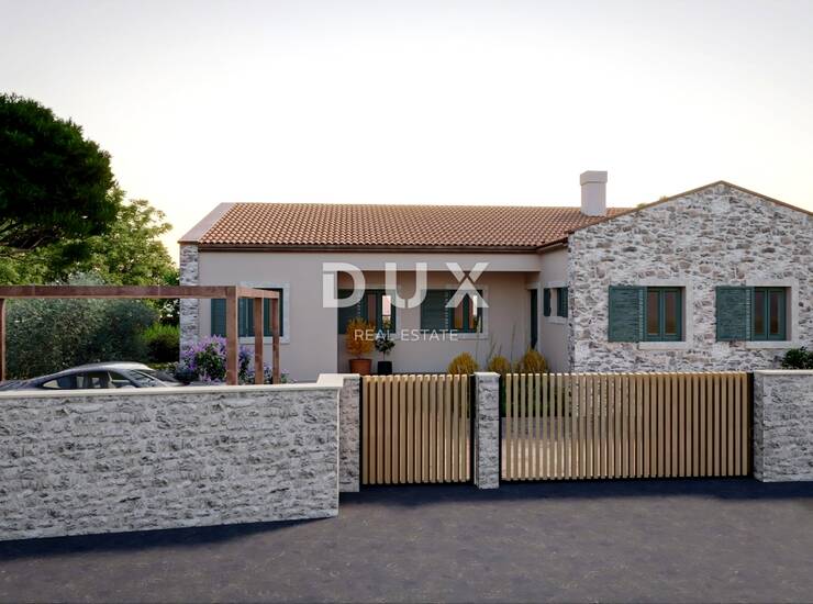 Kuća bezvremenskog dizajna djelomično obložena kamenom se oblikovno i koloristički uklopa u naselje i krajolik. Koncipirana je kao jedna stambena jedinica koja se proteže kroz jednu etažu funkcionalnog tlocrta.