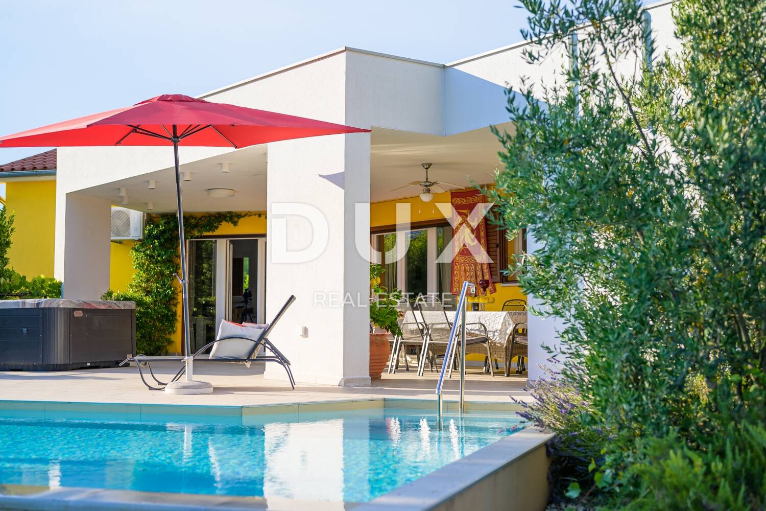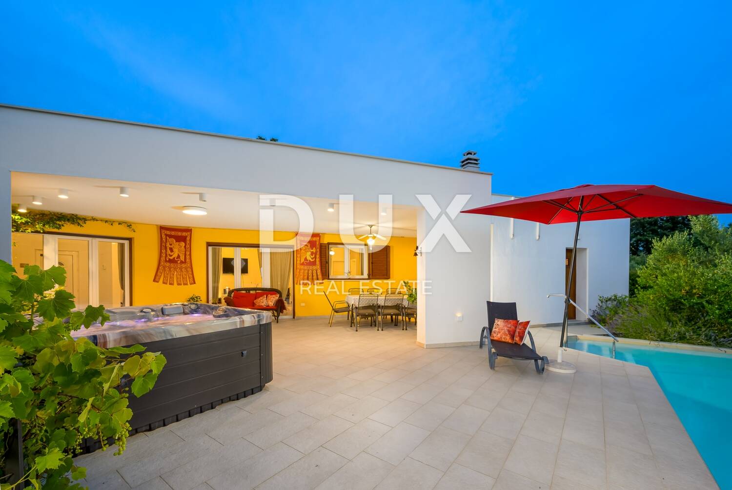Iz blagovaone te dnevnog boravka ulazi se na prostranu vanjsku natkrivenu terasu sa izgrađenim kaminom. Na vanjskom dijelu se još nalazi veliki bazen te jacuzzi.