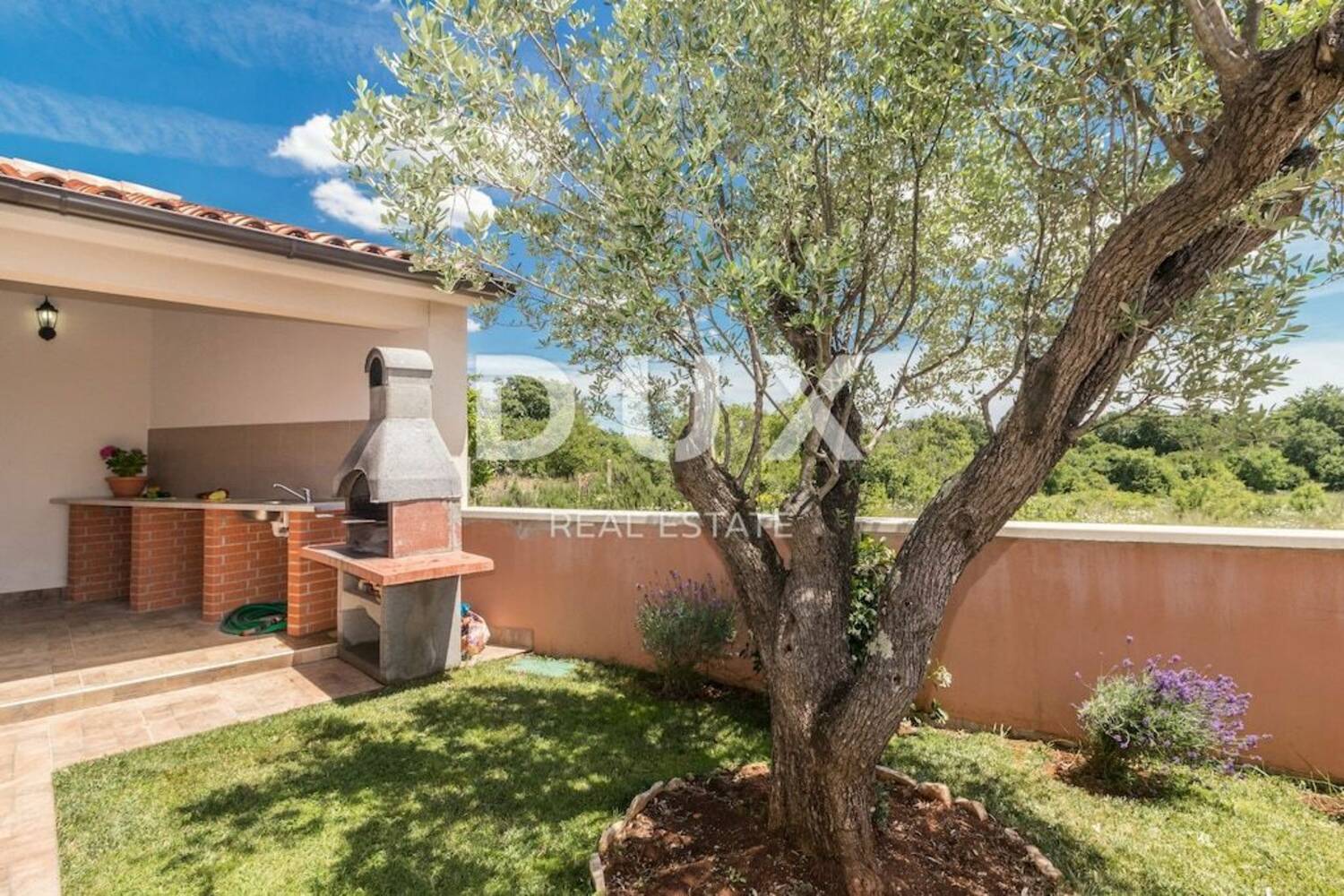 Okućnica je uređena i ograđena površine 800m2 s bazenom i vanjskom kuhinjom.