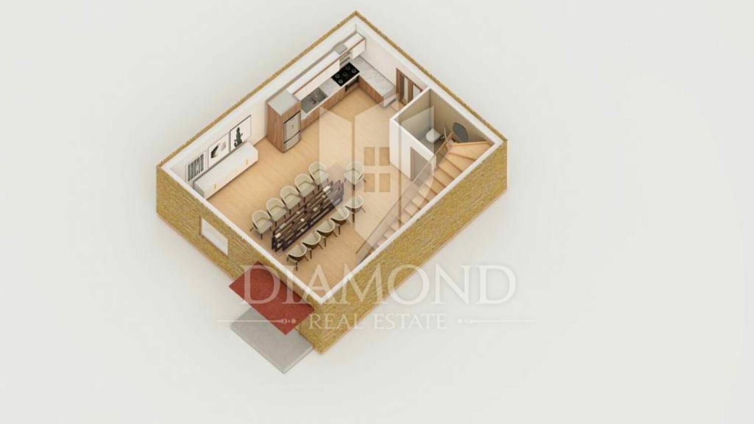 Ova kuća se sastoji od tri etaže gdje se u prizemlju nalazi kuhinja, blagovaonica i dnevni boravak te manji wc. Iz tog prostora izlazi se na stražnji dio okućnice gdje se nalazi bazen, sunčalište i terasa. Na prvom odnosnom drugom katu nalaze se po dvije spavaće sobe i po jedna kupaonica.