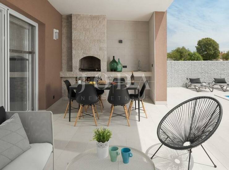 Unutar ograđene okućnice nalazi se bazen sa sunčalištem, te natkrivena terasa sa ljetnom kuhinjom i roštiljem.