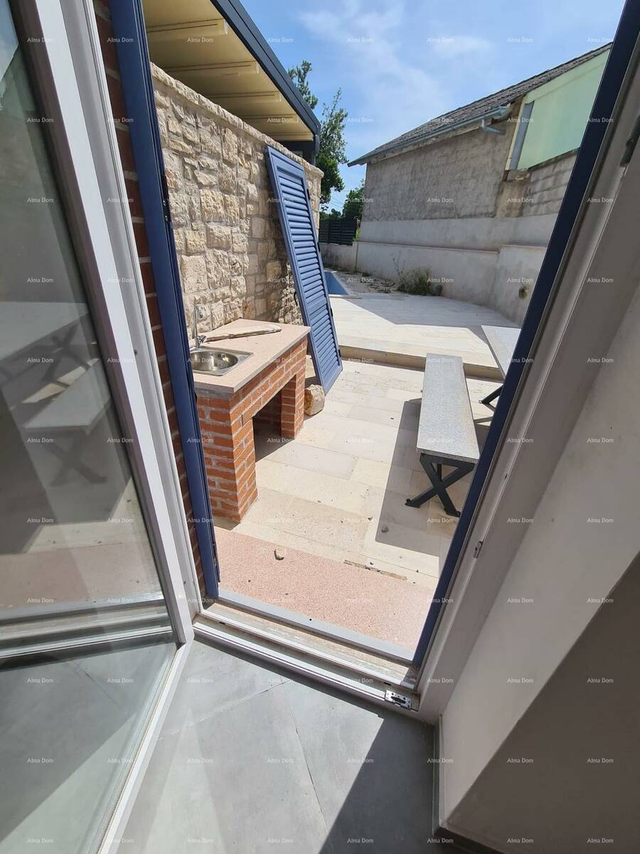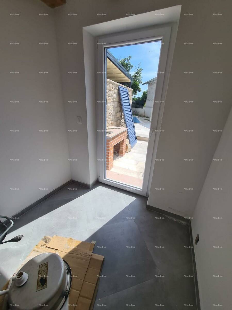 Kuća površine 105 m² prostire se na 2 etaže. U prizemlju se nalazi dnevni boravak s kuhinjom i blagovaonicom, WC, terasa te dvorište s bazenom od 15 m². Na prvom katu smještene su dvije spavaće sobe i kupaonica, dok se u mansardi nalaze dodatne dvije spavaće sobe i još jedna kupaonica.