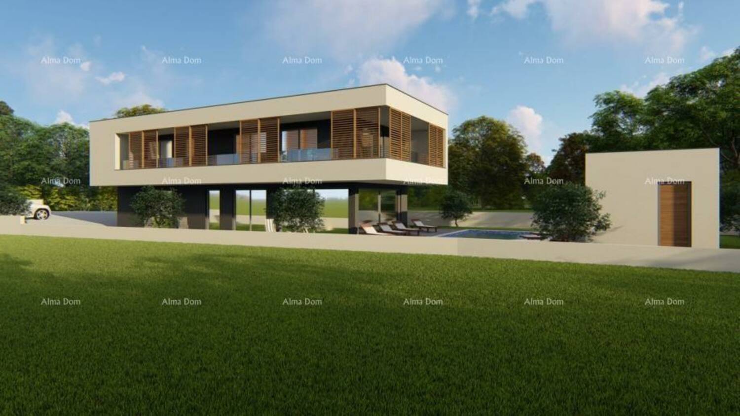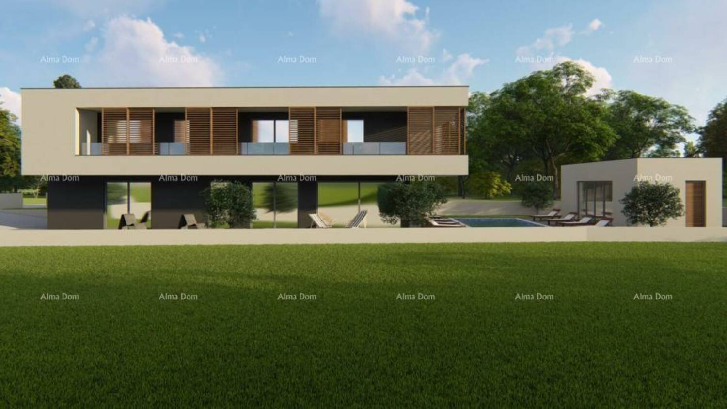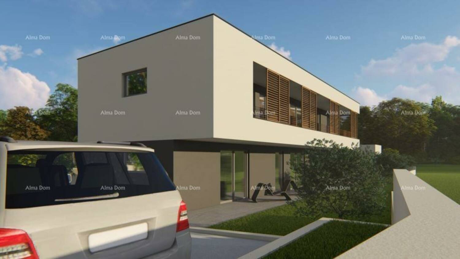 Parcela je pravokutnog i funkcionalnog oblika, a za nju je izrađen moderan arhitektonski projekt s ravnim krovom i grijanim bazenom.