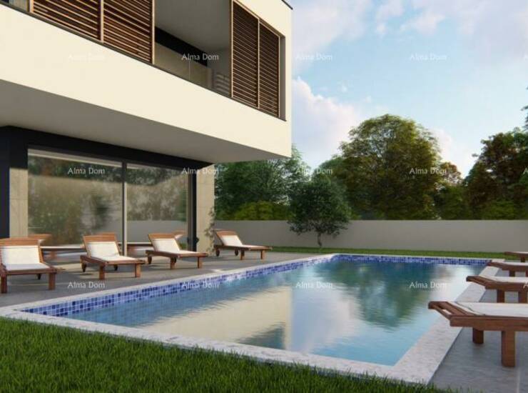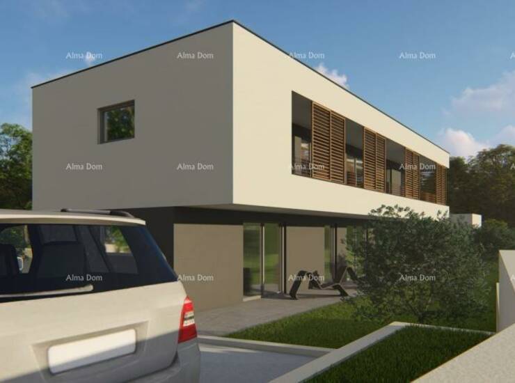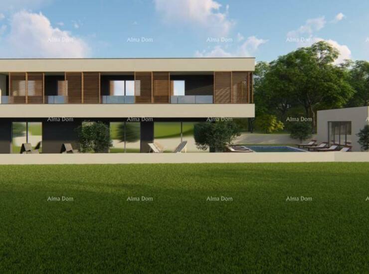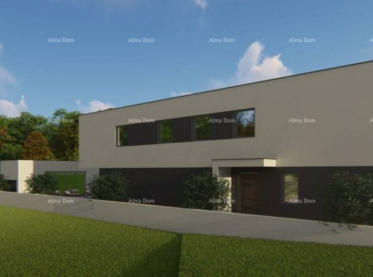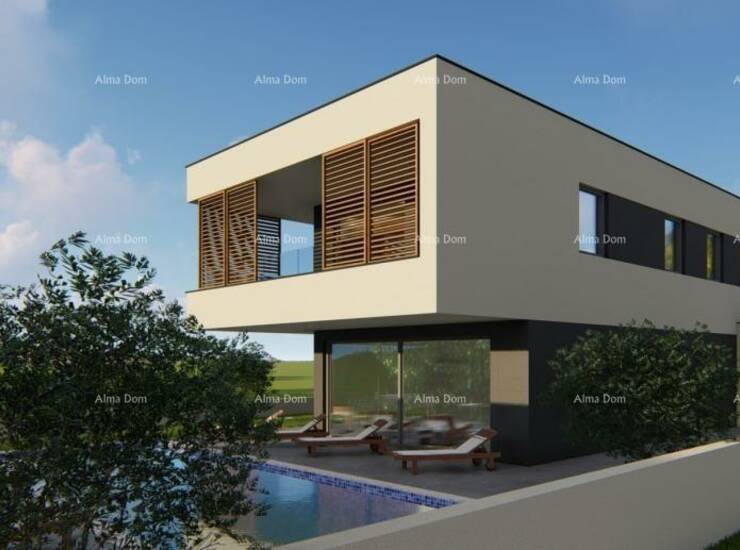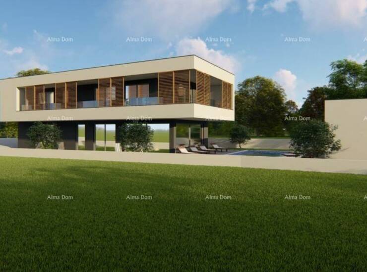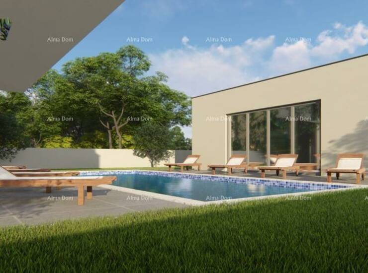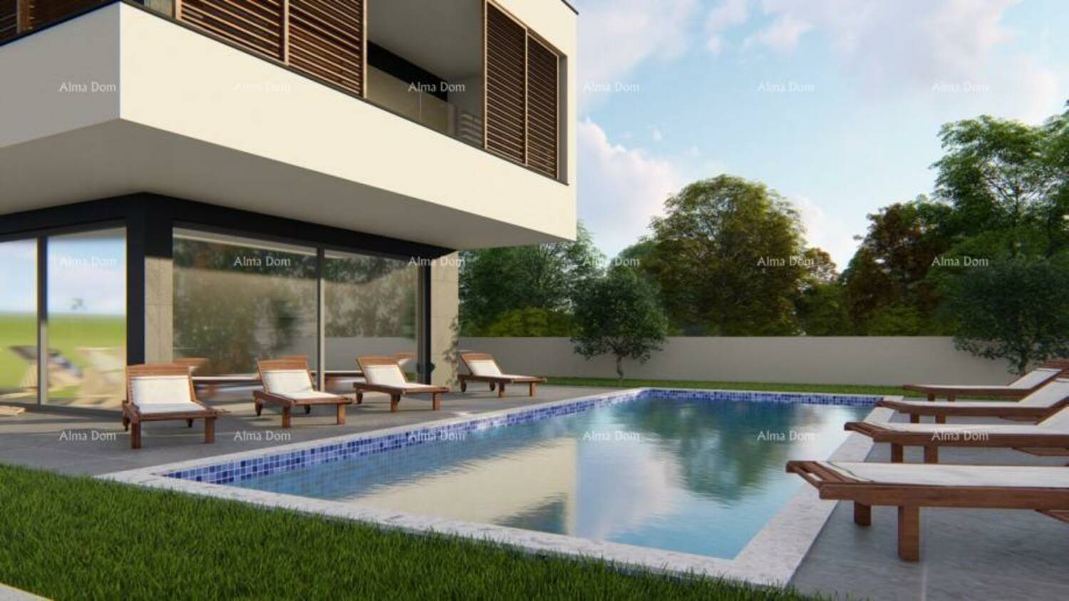 Parcela je pravokutnog i funkcionalnog oblika, a za nju je izrađen moderan arhitektonski projekt s ravnim krovom i grijanim bazenom.