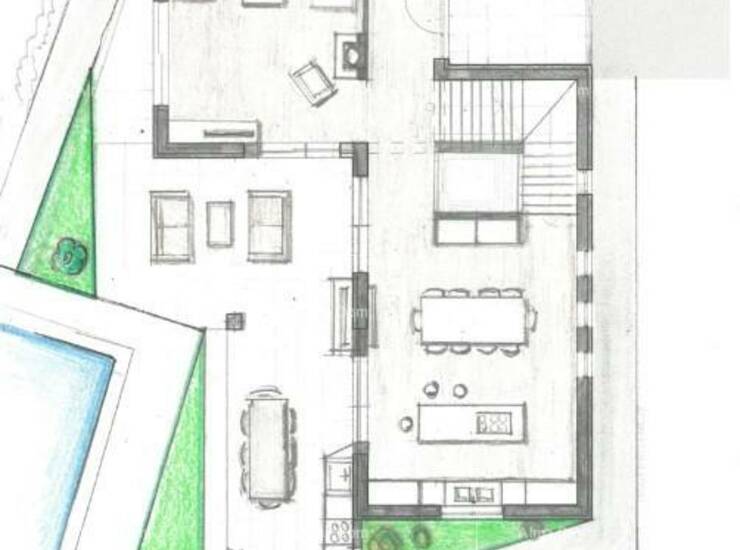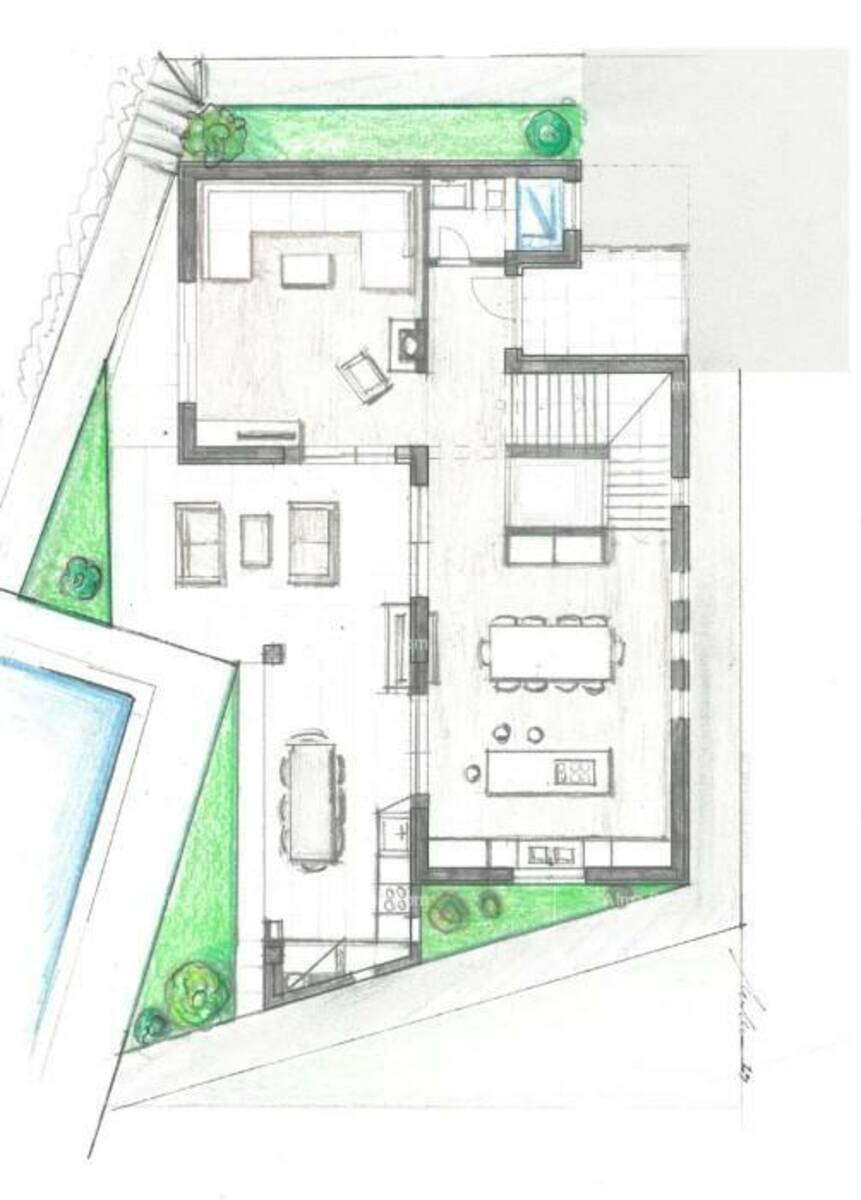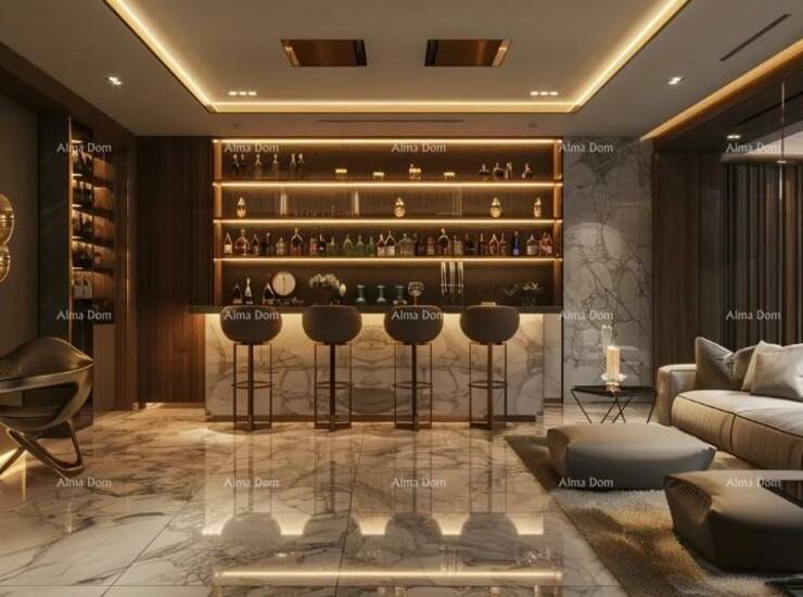 Projekt predviđa moderno dizajniranu kuću s bazenom kroz tri etaže. U osnovnom tlocrtu nalaze se: